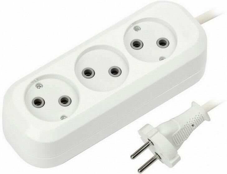 Удлинитель, количество розеток - 3, номинальный ток, А - 10, номинальное напряжение: 250 В; частота: 50 Гц; тип провода: ПВС 2x1,0мм; материал корпуса: АБС-пластик; климатическое исполнение: УХЛ-3; степень защиты от влаги и пыли: IP-20; длина провода - 5 м.