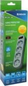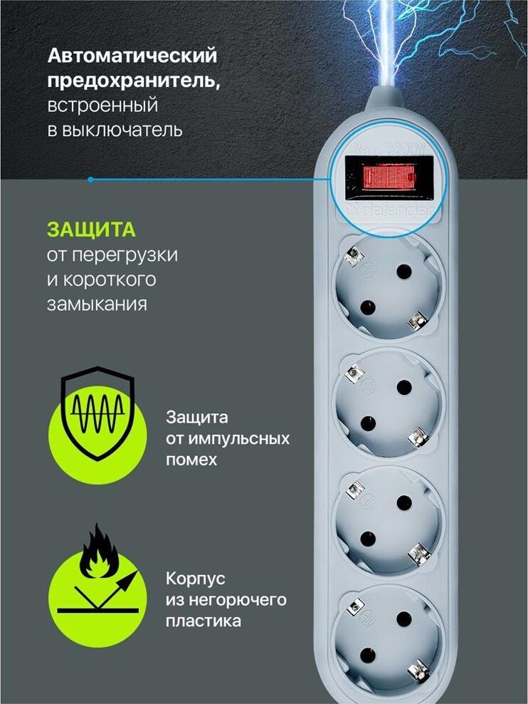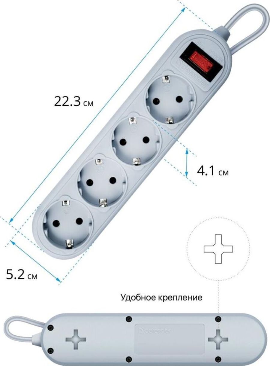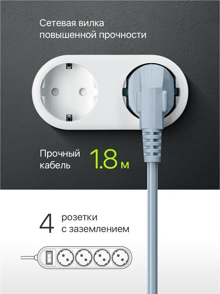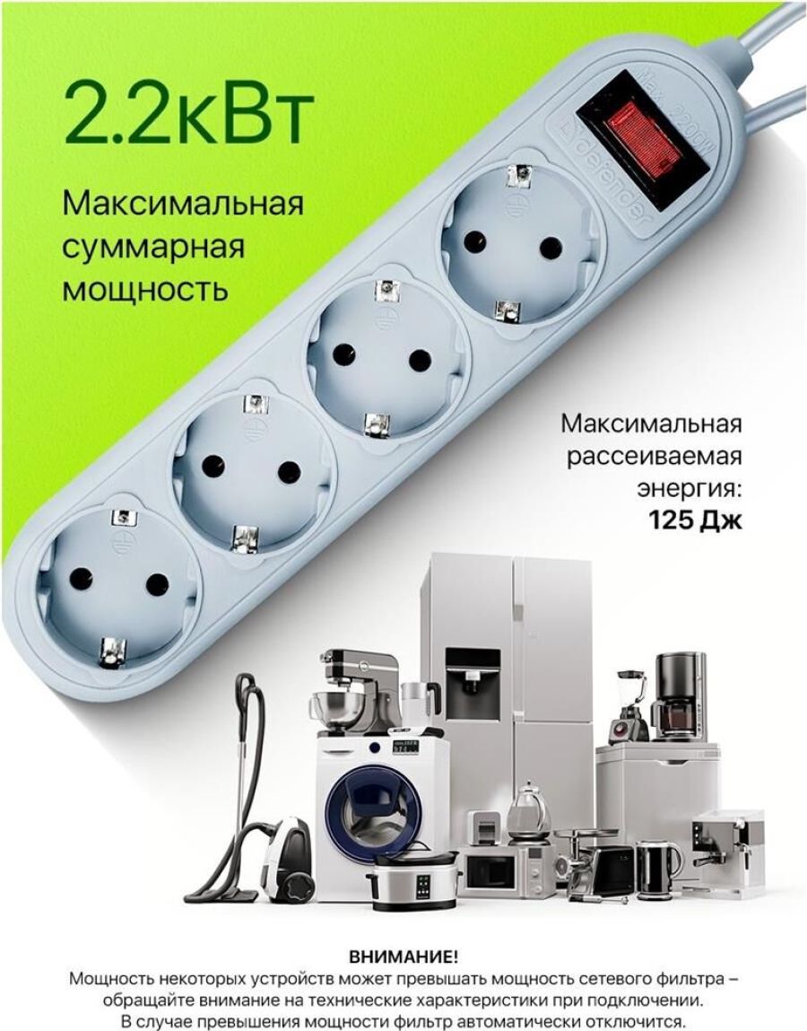 Сетевой фильтр, количество розеток - 4 шт., длина кабеля - 1,8, номинальное напряжение/частота - 230 В / 50 Гц, максимальная суммарная мощность нагрузки - 2200 Вт, максимальный ток нагрузки - 10 А, материал корпуса - негорючий пластик, форма упаковки - картонная коробка.