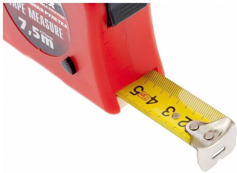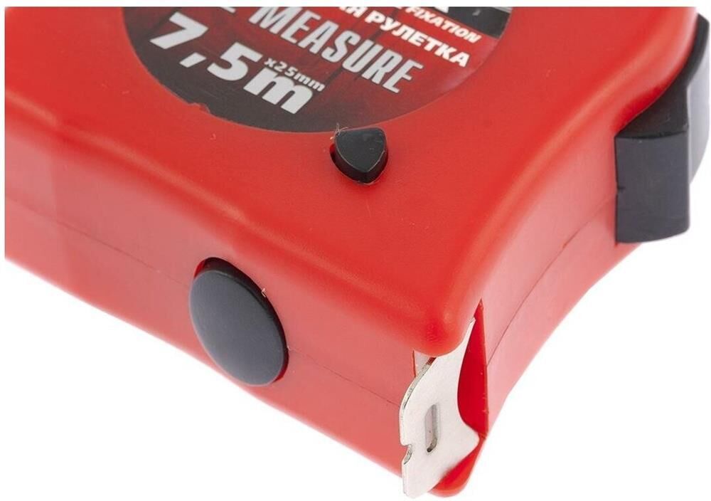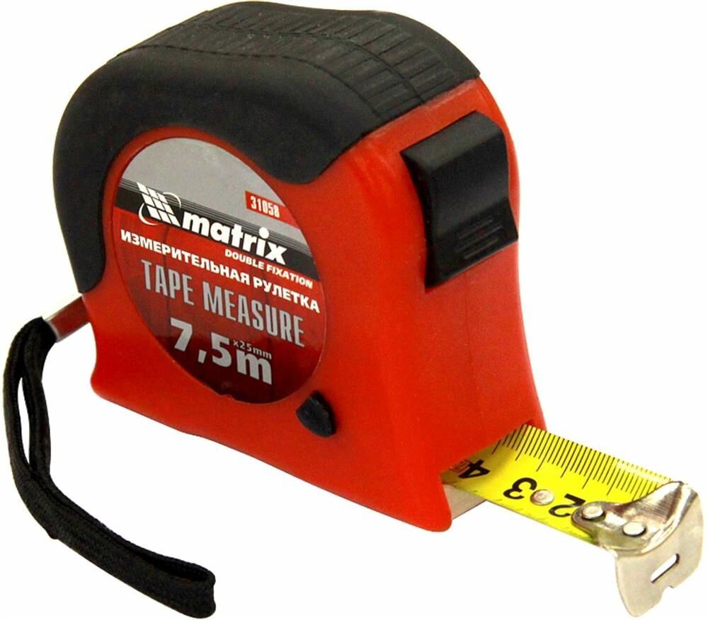 Рулетка Matrix Double fixation 31058, 7,5 м х 25 мм, в обрезиненном корпусе, с двойной плавной фиксацией, предназначена для определения расстояния между двумя точками. Двухкомпонентный корпус из ударопрочного ABS-пластика и ПВХ обеспечивает защиту от механических повреждений. Зацеп надежно зафиксирован заклепками на конце измерительной ленты. Инструмент используется при выполнении строительных и ремонтных работ, а также полезна в быту.ПреимуществаДве кнопки фиксации ленты — стопор и боковая кнопка-пауза, облегчающая проведение частых измерений.Нейлоновый ремешок, позволяющий носить рулетку на запястье.Металлическая скоба, при помощи которой можно закрепить рулетку на поясе.