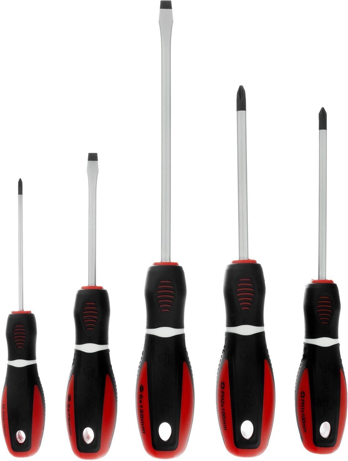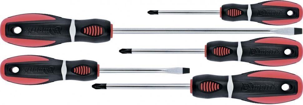 Набор отверток Matrix «Era» 13379 с трехкомпонентными рукоятками, из стали CrV, состоит из 5 инструментов и используется для работы с резьбовыми соединениями. Отвертки подходят для шлицев PH и SL. Благодаря намагниченным наконечникам не нужно придерживать крепеж рукой. Набор рекомендован для профессионального применения и пригодится во время сборки мебели, ремонта бытовой и оргтехники. Преимущества Прочность — стержни выполнены из хромованадиевой стали. Высокий ресурс — рабочие части прошли индукционную закалку и имеют твердость 50-56 HRC. Устойчивость к коррозии — стержни хромированы, наконечники прошли фосфатирование. Комфортная работа — трехкомпонентные рукоятки с насечками в подпальцевых выемках не выскальзывают из руки.