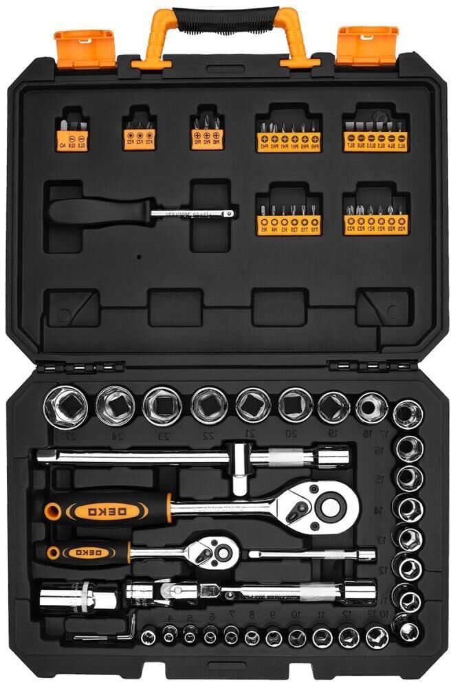 Набор инструментов для авто в кейсе DEKO DKMT72-1 (72 предмета) предназначен для обслуживания автомобилей, а также подойдет для проведения ремонта бытовых конструкций, садовой техники дома и на даче. Все инструменты набора выполнены из стали, что обеспечивает их долгий срок службы. В комплект набора входит: Головки 1/4": 4, 5, 6, 7, 8, 9, 10, 11, 12, 13 мм; 1/2": 10, 11, 12, 13, 14, 15, 16, 17, 18, 19, 20, 21, 22, 23, 24, 27 мм - 26 шт Биты 6,35 мм: H: 3, 4, 5; T: 10, 15, 20, A.D; SL: 3, 4, 5, 5/5, 6, 6, 7; PH: 0, 0, 1, 1, 2, 2, 3, 3; PZ: 0, 0, 1, 1, 2, 2, 2, 3, 3 - 33 шт Отвертка-держатель 1/4" - 1 шт Шестигранные ключи: 1.5, 2, 2.5 мм - 3 шт Удлинители: 1/4", 1/2" - 2 шт Удлинитель с адаптером для головок: 1/2" - 1 шт Держатель для бит 1/4" - 1 шт Карданный шарнир 1/2" 1 шт Головки свечные: 1/2"х21 мм - 1 шт Трещотки: 1/4", 1/2" - 2 шт Руководство по эксплуатации - 1 шт