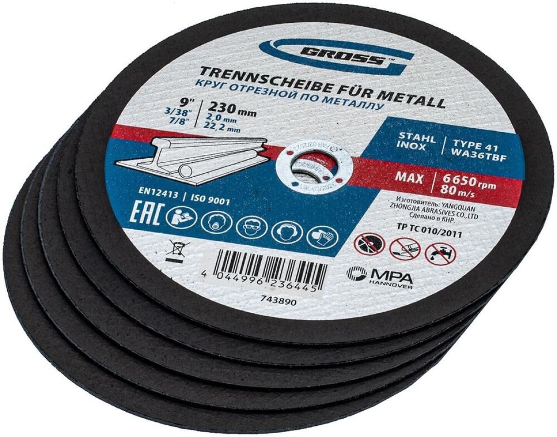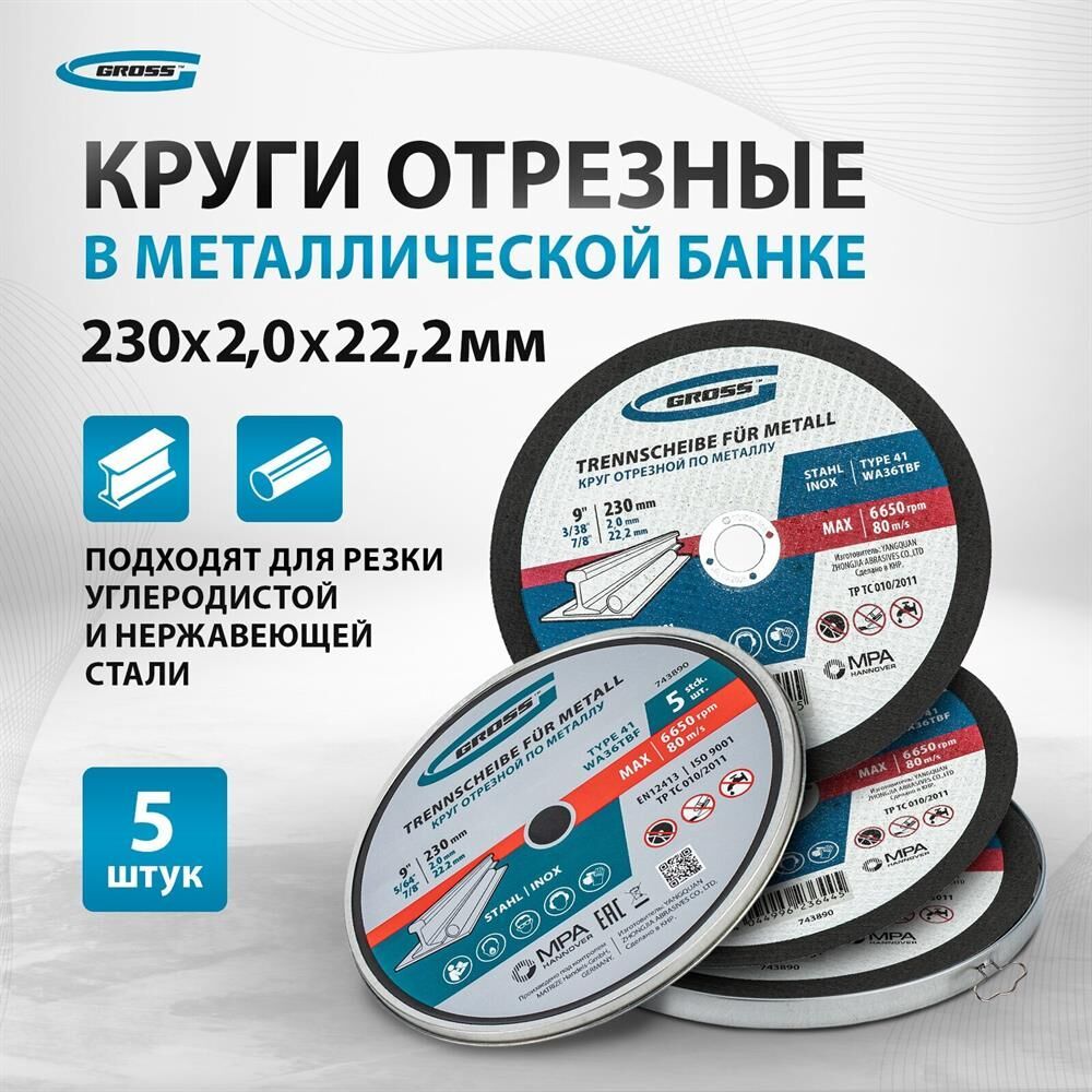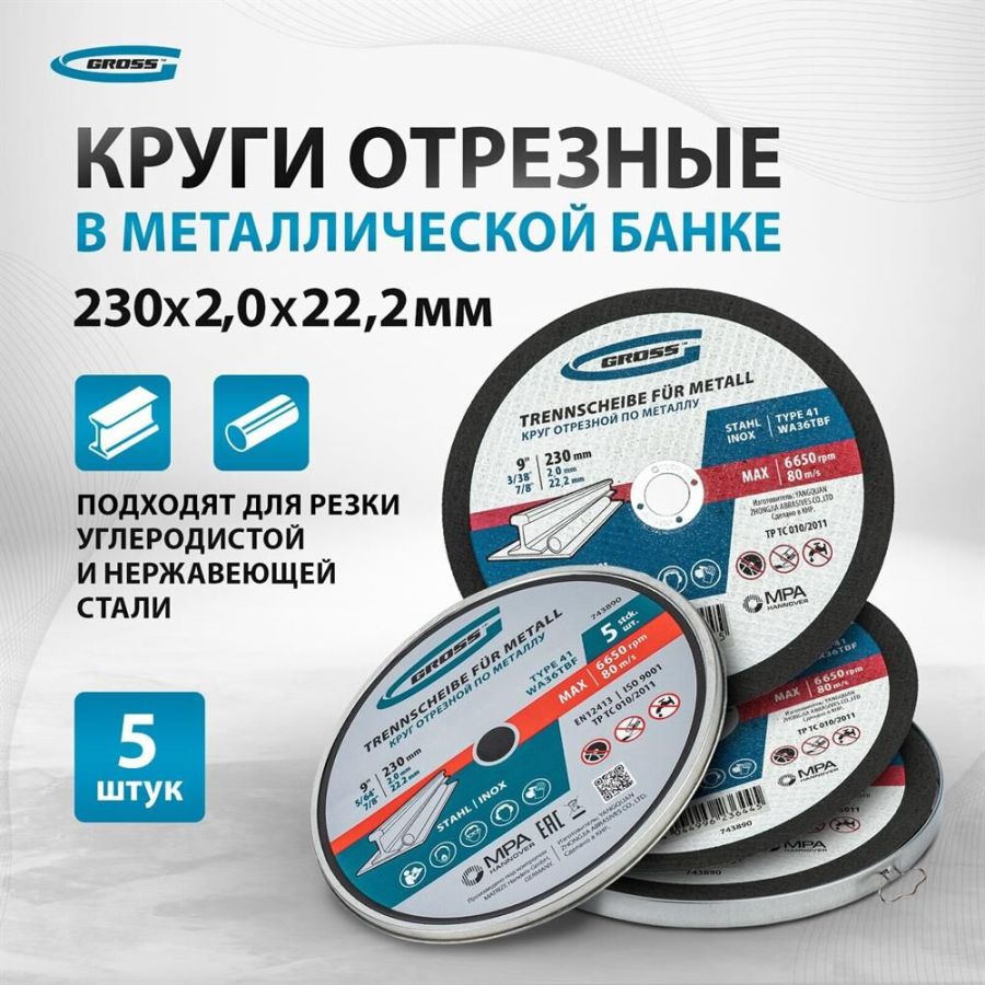 Круг отрезной по металлу Gross 743890 (WA36TBF) размером 230 х 2,0 х 22,2 мм, 5 шт. в металлической банке, предназначен для интенсивного реза легированных (нержавеющих) и углеродистых (черных) сталей. Устанавливается на УШМ соответствующего типоразмера. Крупнозернистый абразив F36 и толщина оснастки 2 мм обеспечивают оптимальный баланс прочности и скорости реза. Надежный и производительный, круг выдерживает высокие нагрузки и подходит для профессиональной эксплуатации (сухой рез).ПреимуществаОчень высокий ресурс — абразив из монокорунда со специальными добавками характеризуется повышенной износостойкостью.Безопасная работа — высококачественная двухслойная стеклосетка защищает круг от перегрузок, предотвращая его разрушение в случае зажатия в материале.Минимальное количество пыли и искр — благодаря специальному составу оснастка слабо нагревается в процессе реза, износ происходит медленно и равномерно.