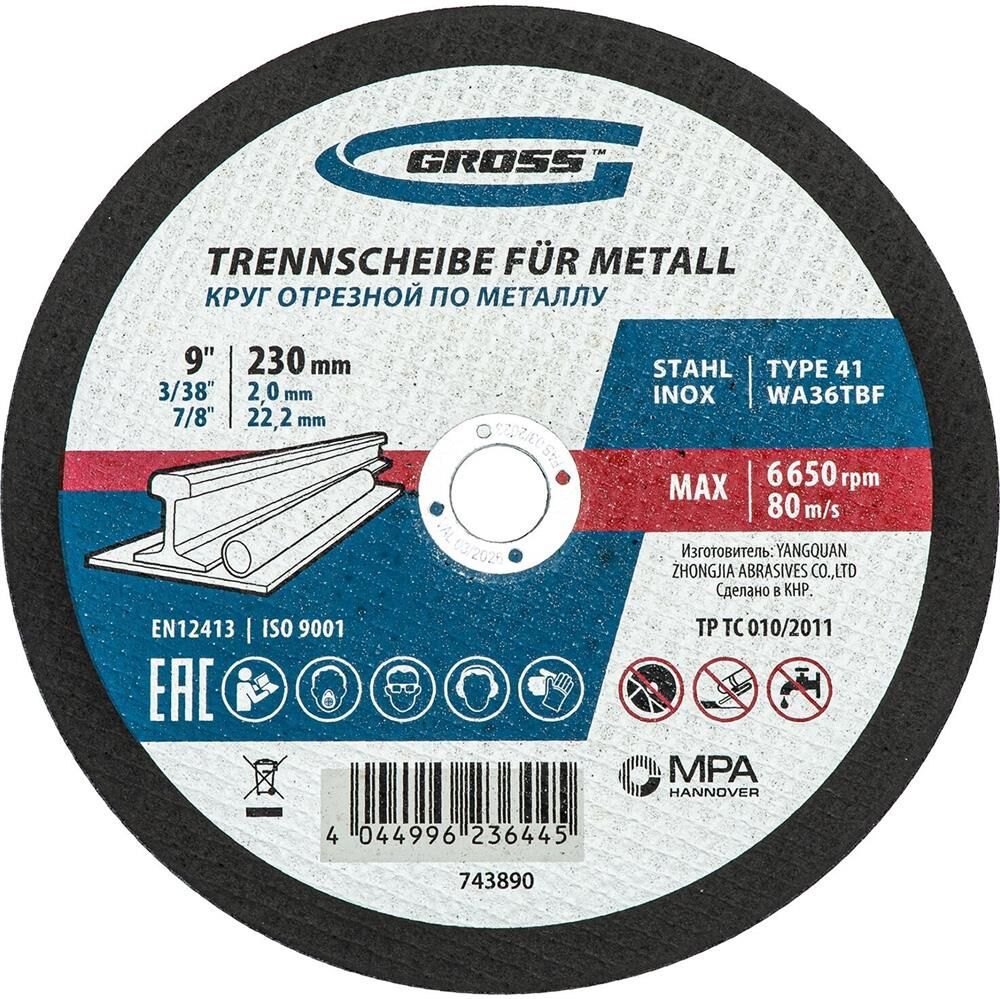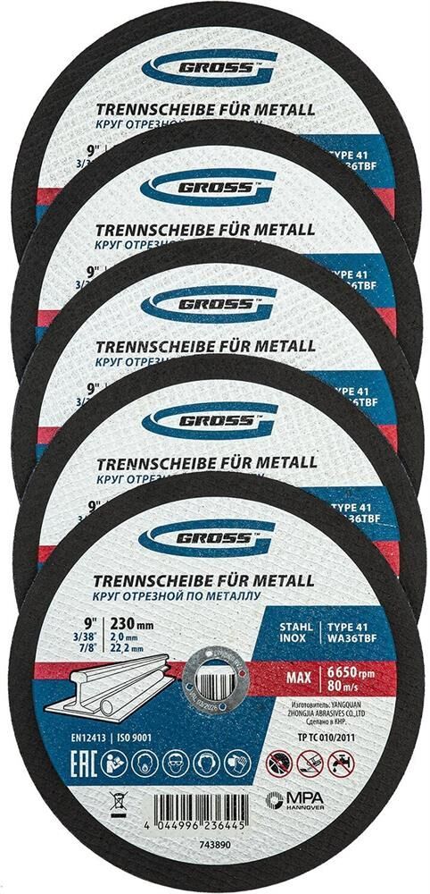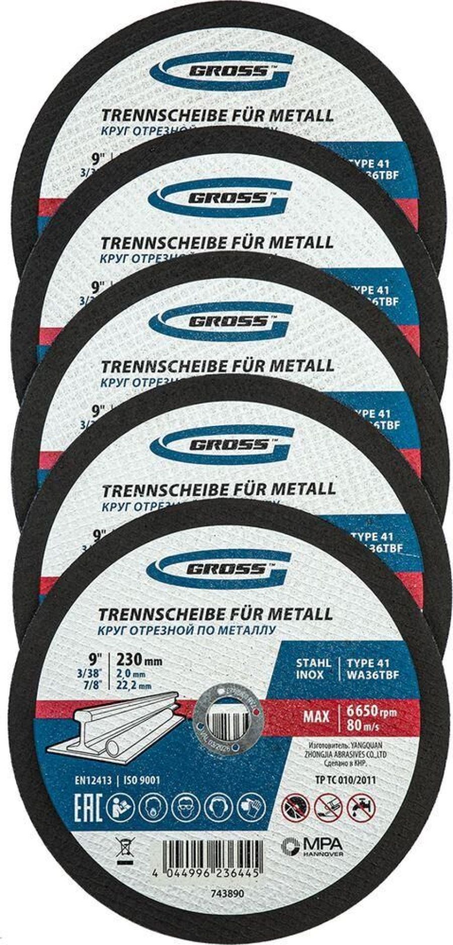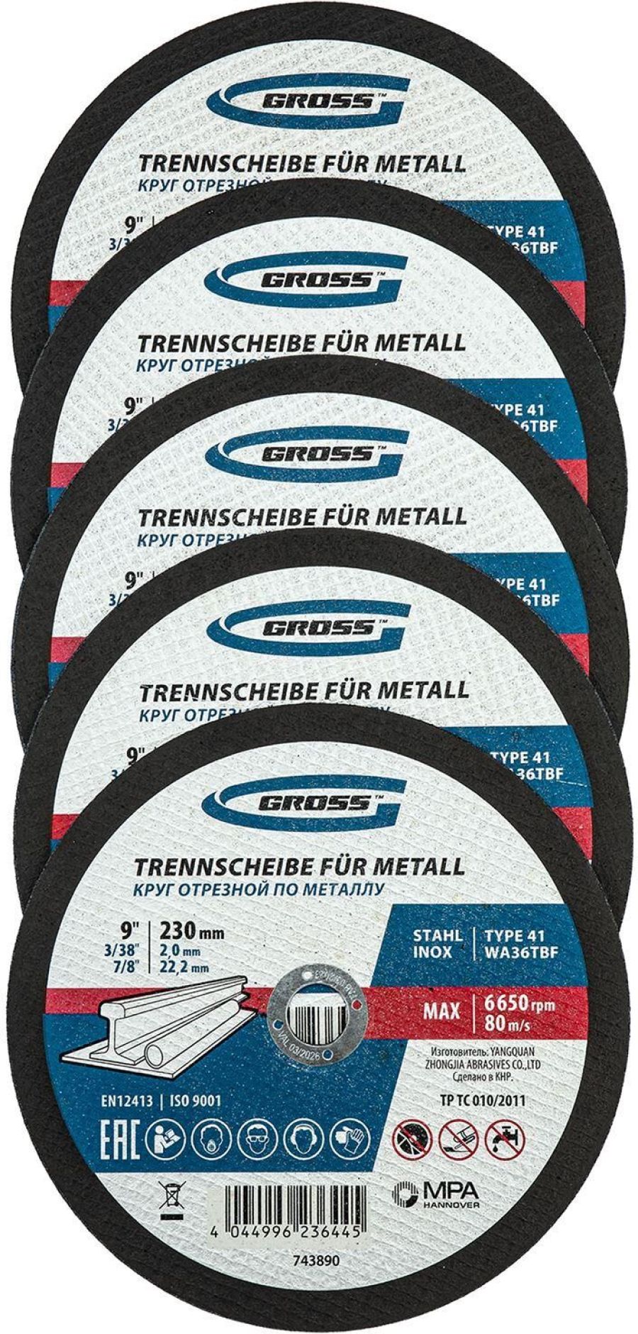 Круг отрезной по металлу Gross 743890 (WA36TBF) размером 230 х 2,0 х 22,2 мм, 5 шт. в металлической банке, предназначен для интенсивного реза легированных (нержавеющих) и углеродистых (черных) сталей. Устанавливается на УШМ соответствующего типоразмера. Крупнозернистый абразив F36 и толщина оснастки 2 мм обеспечивают оптимальный баланс прочности и скорости реза. Надежный и производительный, круг выдерживает высокие нагрузки и подходит для профессиональной эксплуатации (сухой рез).ПреимуществаОчень высокий ресурс — абразив из монокорунда со специальными добавками характеризуется повышенной износостойкостью.Безопасная работа — высококачественная двухслойная стеклосетка защищает круг от перегрузок, предотвращая его разрушение в случае зажатия в материале.Минимальное количество пыли и искр — благодаря специальному составу оснастка слабо нагревается в процессе реза, износ происходит медленно и равномерно.