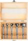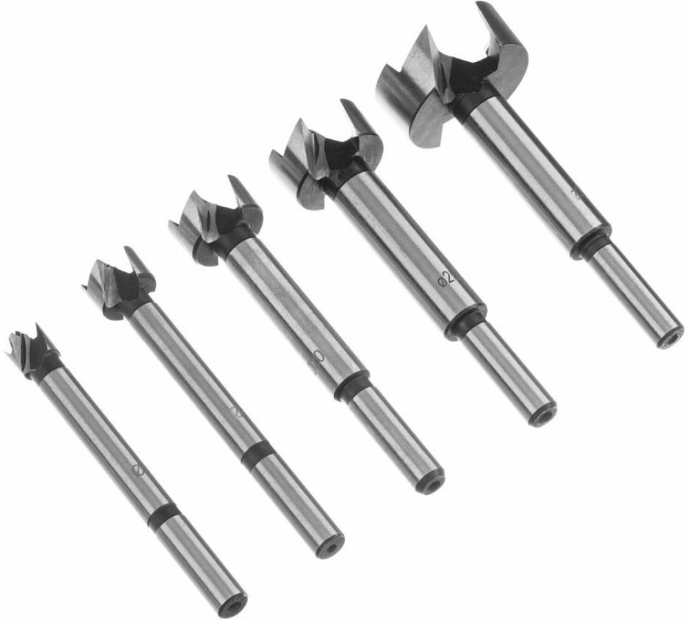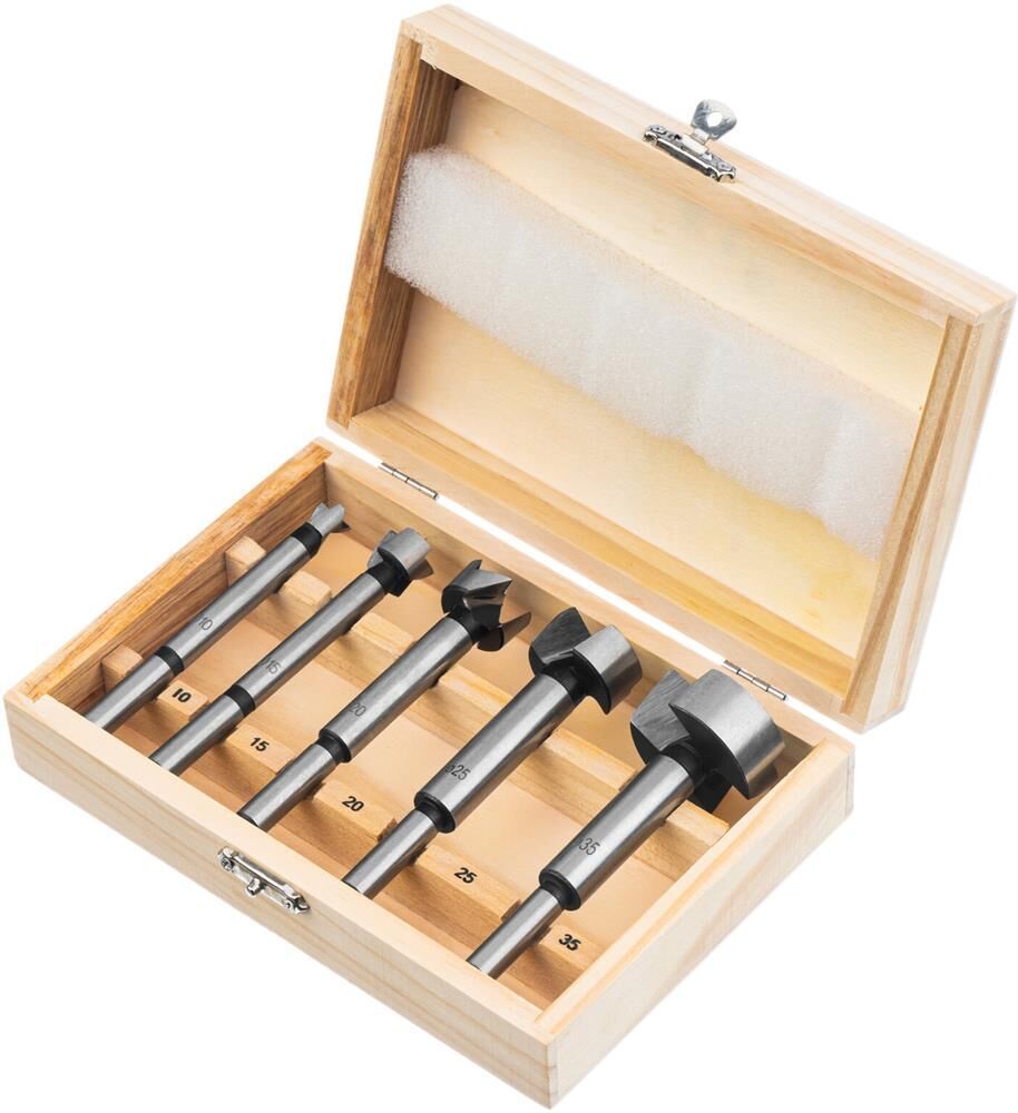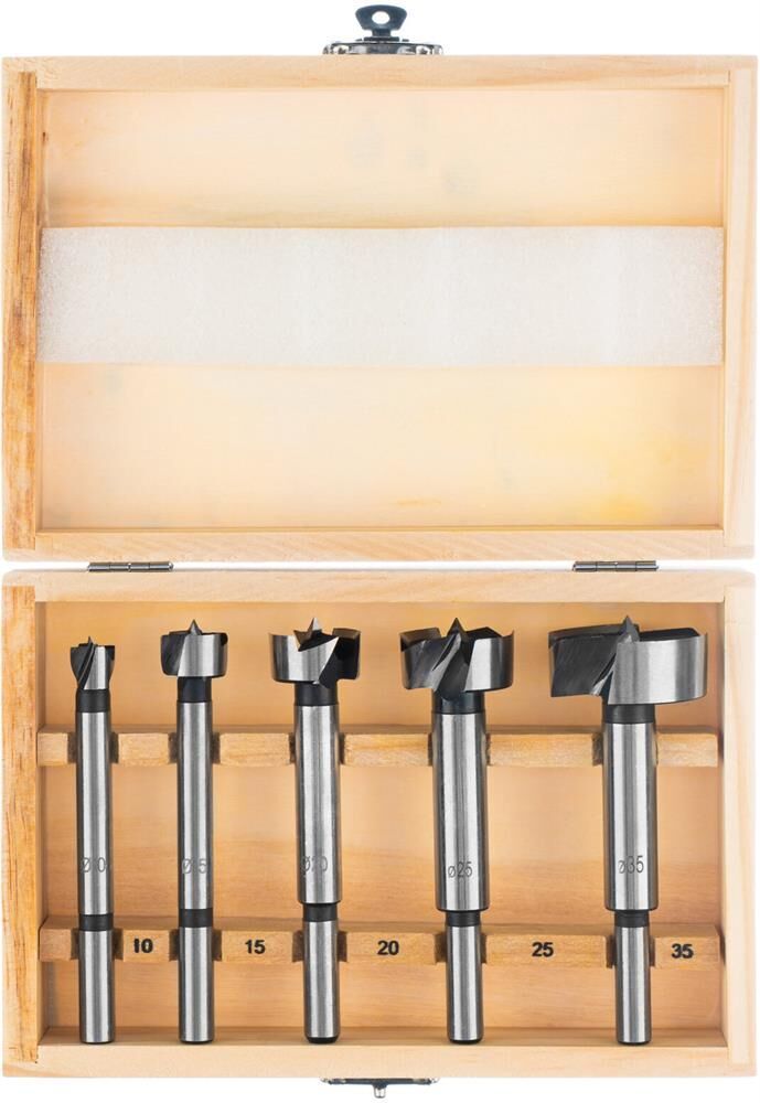 Набор сверл Форстнера по дереву Sparta 704405 включает 5 сверл размером 10-15-20-25-35 мм с цилиндрическими хвостовиками, упакованных в деревянный бокс. Они позволяют получать в древесине, МДФ, ДСП и других материалах неглубокие глухие отверстия с очень ровными краями и дном. Сверла используют для установки замков, дверных петель, наличников.Преимущества Сталь 45 — сверла прочны и долговечны. Твердость 40-43 HRC — режущие части сверл устойчивы к износу. Центрирующие шипы — сверла не отклоняются от оси сверления. Прочный деревянный кейс — набор удобен для хранения и транспортировки.
