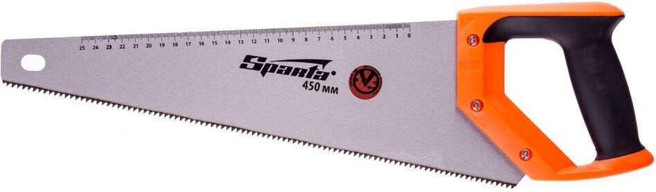 Ножовка по дереву Sparta 235025 с полотном длиной 450 мм, с калеными зубьями с 2D-заточкой и шагом 7-8 TPI, с двухкомпонентной рукояткой, используется во время столярных и плотницких работ. Зубья имеют двухгранную заточку, поэтому ножовкой можно пилить как от себя, так и на себя. Шаг зубьев составляет 7-8 TPI, что обеспечивает быстрый рез. В случае снижения производительности пилы ее рабочую кромку можно заточить.ПреимуществаПолотно из пружинной стали 65Mn устойчиво к динамическим нагрузкам.Каленые зубья твердостью 55 HRC обладают высокой износостойкостью и долго сохраняют режущую способность.Покрытое лаком полотно не подвержено коррозии.Рукоятка надежно прикреплена к полотну 3 винтами, поэтому оно не выпадет во время пиления.Двухкомпонентная эргономичная рукоятка надежно лежит в руке, что повышает комфортность работы.