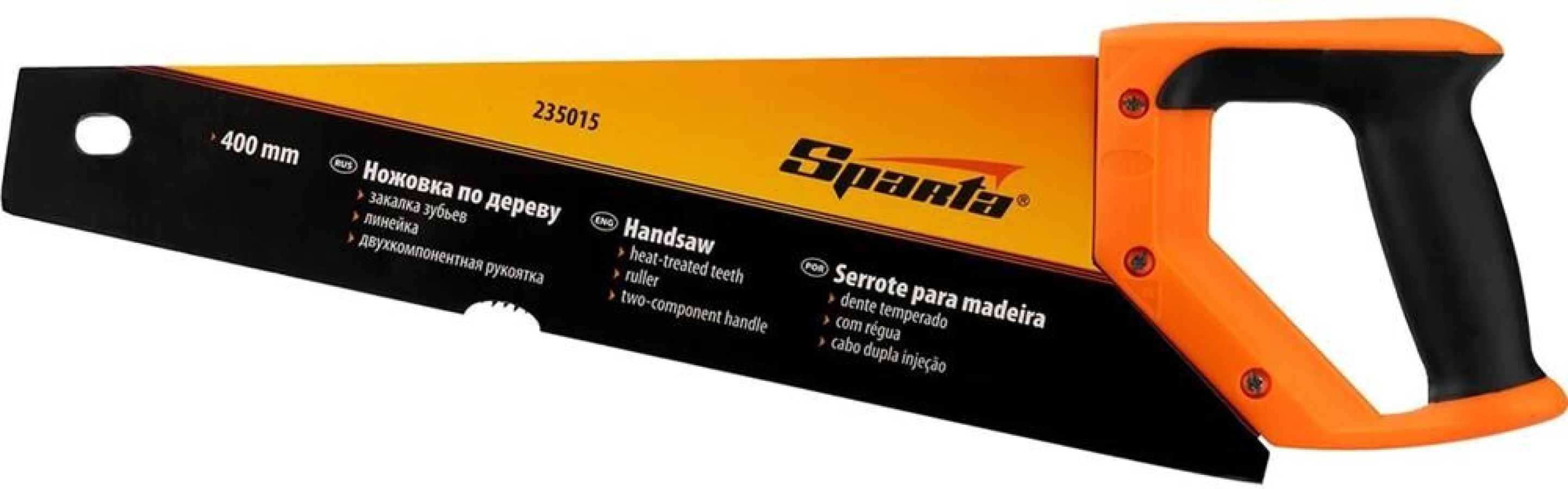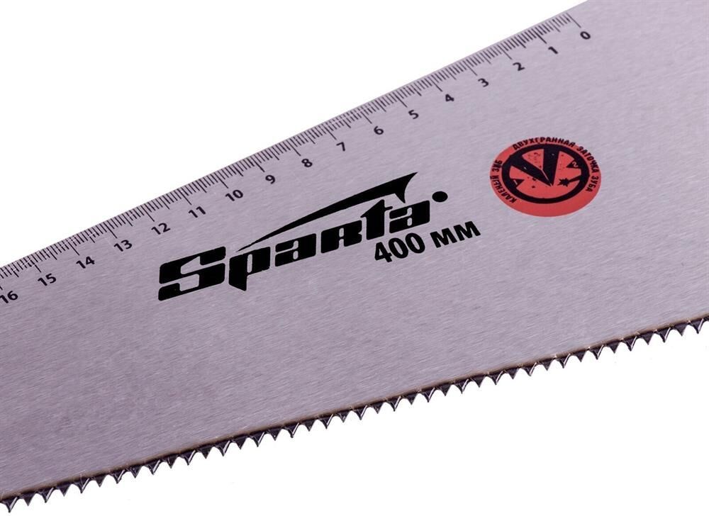 Ножовка по дереву Sparta 235015 с полотном длиной 400 мм, с калеными зубьями с 2D-заточкой и шагом 7-8 TPI, с двухкомпонентной рукояткой, используется во время столярных и плотницких работ. Зубья имеют двухгранную заточку, поэтому ножовкой можно пилить как от себя, так и на себя. Шаг зубьев составляет 7-8 TPI, что обеспечивает быстрый рез. В случае снижения производительности пилы ее рабочую кромку можно заточить.ПреимуществаПрочность и износостойкость — полотно из пружинной стали 65Mn устойчиво к динамическим нагрузкам, каленые зубья твердостью 55 HRC долго сохраняют режущую способность.Долговечность — полотно покрыто лаком для защиты от коррозии.Надежность — полотно, закрепленное 3 винтами, не выпадет во время пиления.Комфортная работа — двухкомпонентная эргономичная рукоятка надежно лежит в руке.