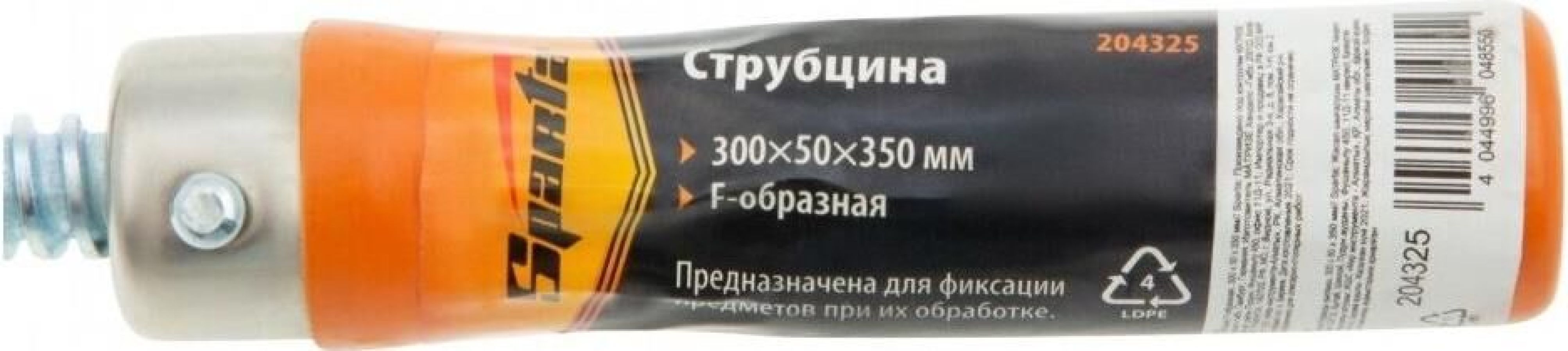 F-образная струбцина Sparta 204325 длиной 350 мм и величиной зажима 300 х 50 мм позволяет фиксировать заготовки из металла, древесины и других материалов для их соединения или обработки. Используется в столярном и слесарном деле. Деталь помещают между губками, одна из которых подвижна и служит для регулировки величины захвата. Винтовой зажим позволяет фиксировать заготовку со значительным усилием. Элементы конструкции выдерживают высокую температуру, поэтому струбцина подходит для проведения сварочных работ, при этом пластиковые накладки необходимо снять.ПреимуществаПрочность — стальная штанга выдерживает значительные изгибающие нагрузки.Длительный срок службы — оцинкованный винт устойчив к коррозии.Аккуратная работа — защитные накладки на губках предотвращают повреждение детали.Комфортная эксплуатация — удобная деревянная рукоятка надежно ложится в руку.