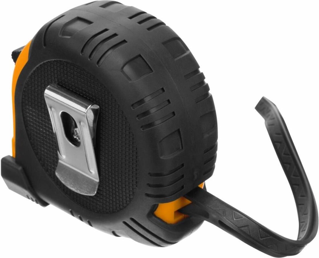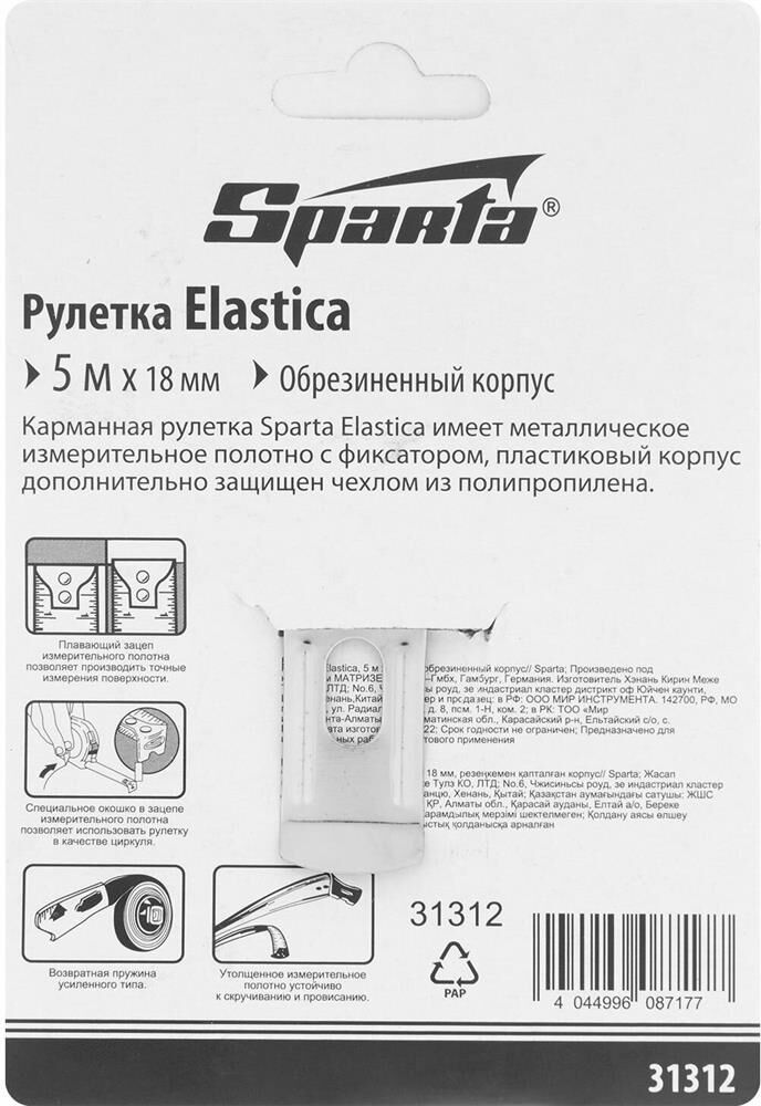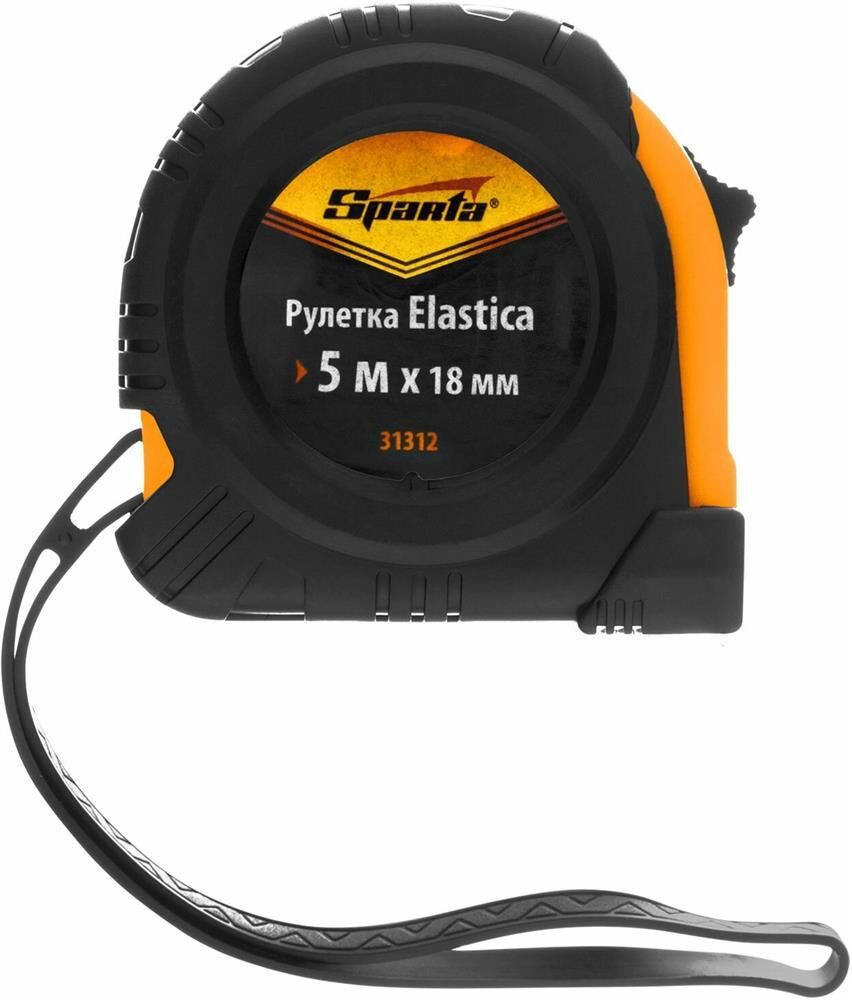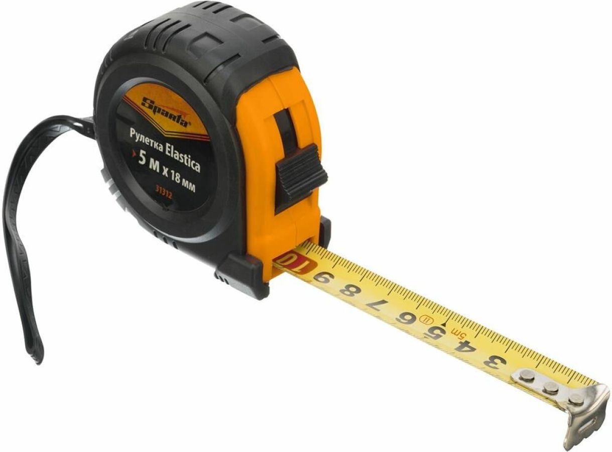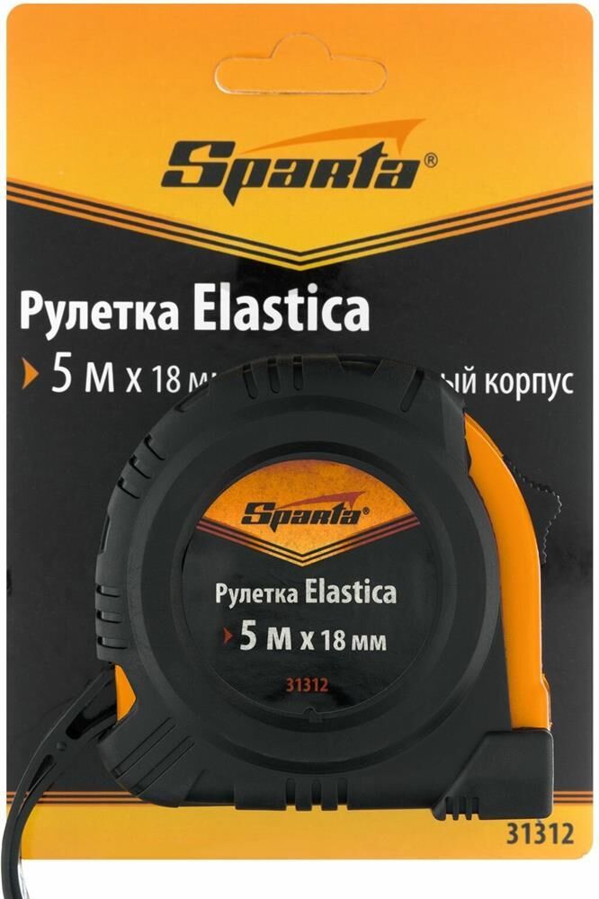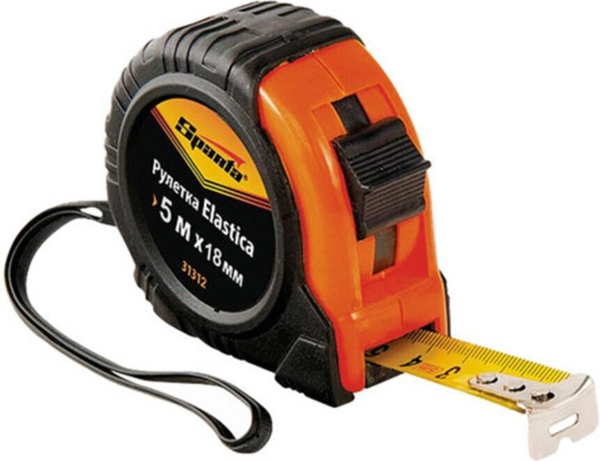 Рулетка Sparta «Elastica» 31312 с лентой 5 м х 18 мм, в обрезиненном корпусе, — это универсальный инструмент для измерения длины заготовок, различных поверхностей, мебели, дверных и оконных проемов и т.д. Она будет полезна в быту, на даче, в гараже, в мастерской. Благодаря окошку на зацепе ее также можно использовать в качестве циркуля.ПреимуществаНадежность и долговечность конструкции рулетки достигается за счет обрезиненного пластикового корпуса и возвратной пружины.Лента покрыта защитной краской, таким образом достигается ее износостойкость.Рулетка оснащена механическим стопором, благодаря которому ленту можно удерживать на нужной длине.Плавающий зацеп позволяет производить измерения с точностью до миллиметра.Толщина ленты составляет 18 мм, что позволяет работать в труднодоступных местах.Шкала, нанесенная крупными символами, легко читается даже на расстоянии.Три заклепки надежно фиксируют зацеп на ленте.