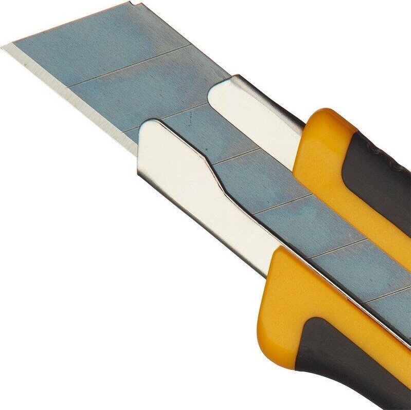 Материал лезвия: сталь Материал рукояти: двухкомпонентный Ширина лезвия, мм: 18 Обрезиненная рукоятка: есть Выдвижное лезвие: есть Складной: нет Фиксатор: механический Дополнительный винтовой фиксатор: есть Форма: сегментированное Конструкция: выдвижной Кассета с запасными лезвиями: нет Автозамена лезвий: нет