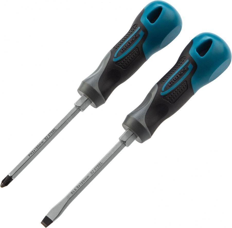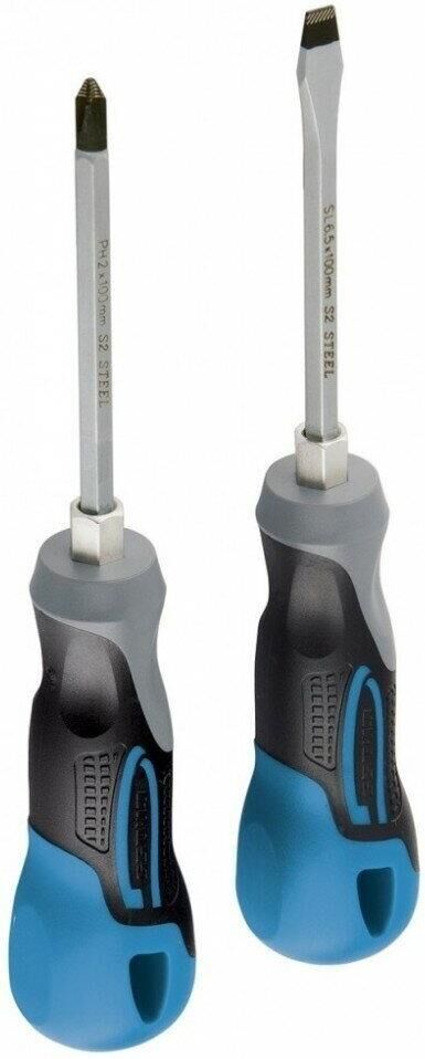 Комбинированный набор Gross 12168 включает 2 отвертки из стали S2, с трехкомпонентными рукоятками, позволяющих осуществлять монтаж/демонтаж крепежных элементов типа Philips и Slotted. Он используется для решения профессиональных задач при проведении строительных, ремонтных и монтажных работ. Длина стержней отверток составляет 75-100 мм, поэтому набор оптимален для работы с легкодоступными резьбовыми соединениями.ПреимуществаИзносостойкость и долговечность — отвертки изготовлены из высококачественной инструментальной стали S2.Высокий ресурс — стержни отверток прошли индукционную закалку, их твердость составляет 56-58 HRC.Удобство использования — шлицы со специальными насечками и фосфатным покрытием надежно сцепляются с головкой крепежа, что снижает риск его повреждения.Защита от ржавчины — хромовое покрытие стержней предотвращает образование коррозии.Намагниченные наконечники — крепеж удобно направлять в отверстие одной рукой, т.к. он не спадает со шлица.Расширенный функционал — шестигранные выступы на рукоятк