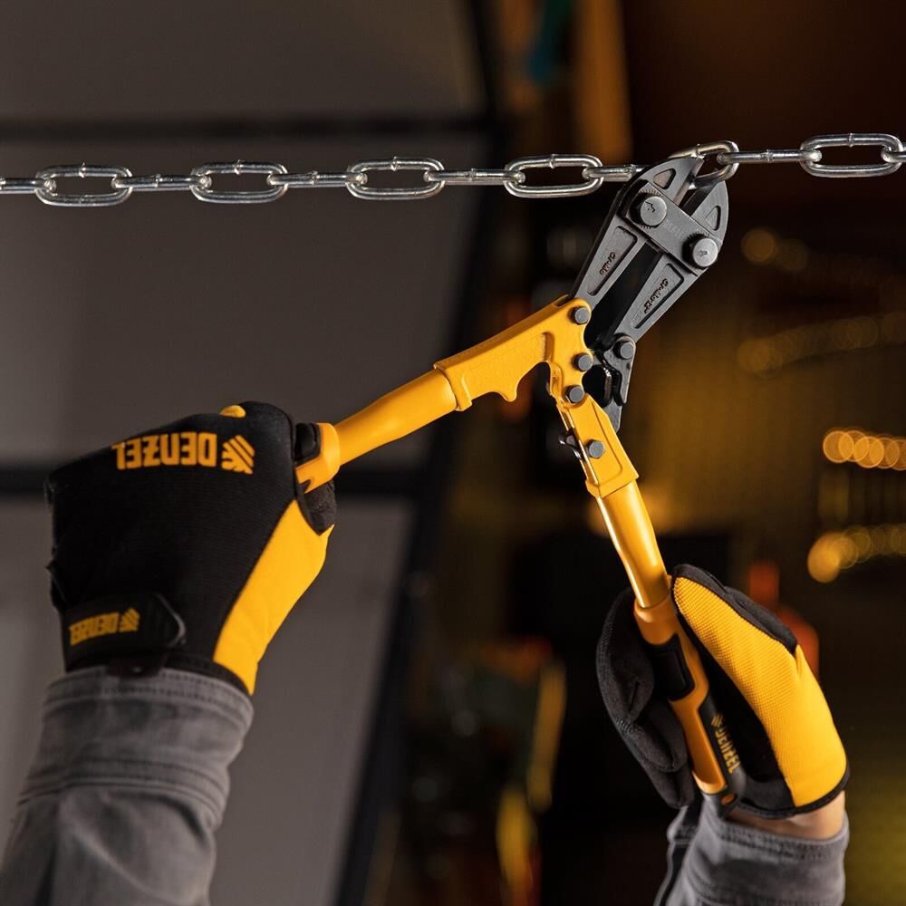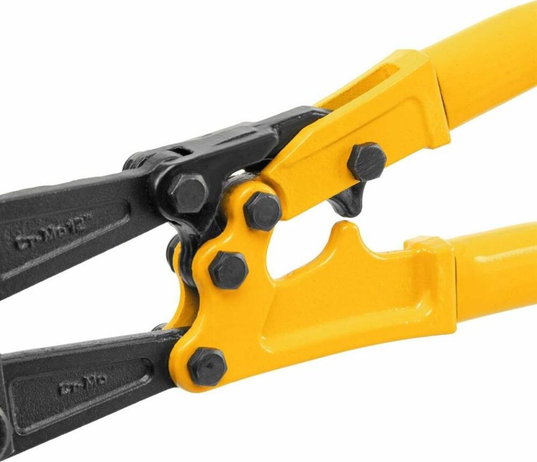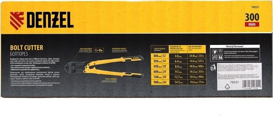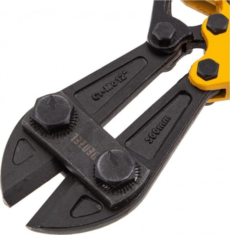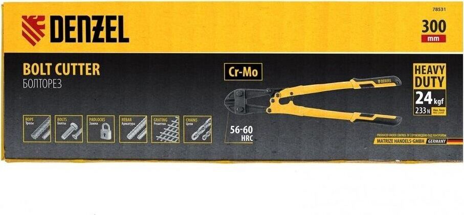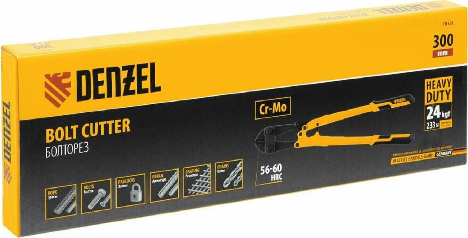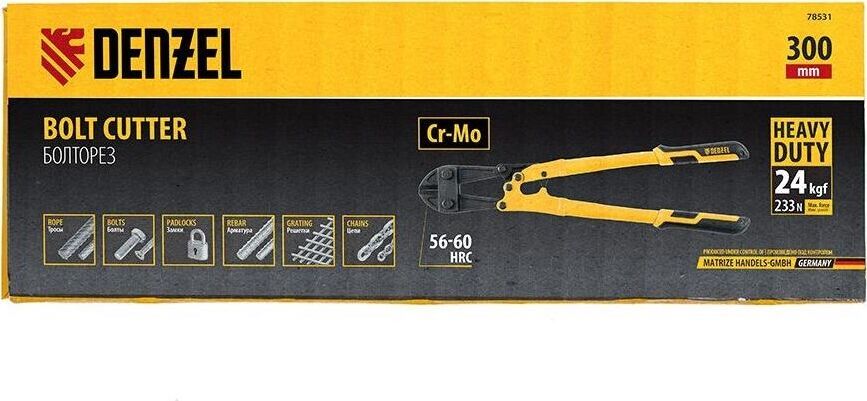 Болторез Denzel 78531 длиной 300 мм (12 дюймов), из стали Cr-Mo, предназначен для перекусывания стальных прутков диаметром 4,8 мм, болтов и шурупов, разнородной проволоки.ПреимуществаИзносостойкие губки, выполненные из стали CrMo, обладают повышенной прочностью и жесткостью.Твердость рабочих губок 56-60 HRC позволяет работать с прочными материалами.Дополнительный рычаг уменьшает прикладываемое усилие.Эксцентриковый механизм регулирует прилегание рабочих губок друг к другу.Эргономичные рукоятки удобно лежат в руке.