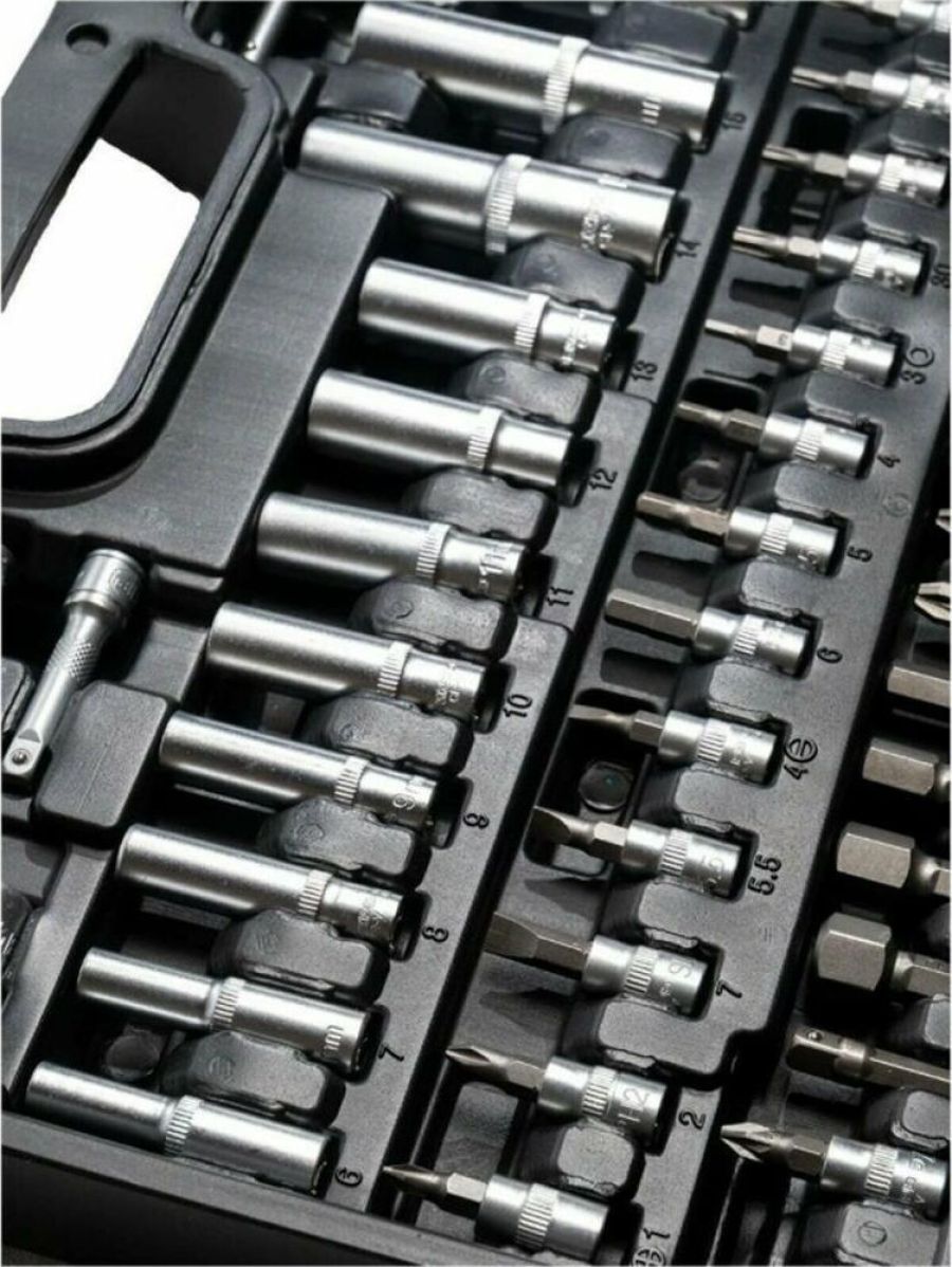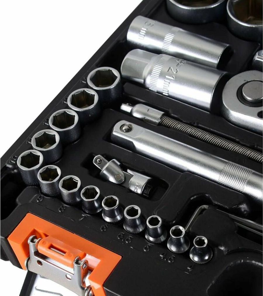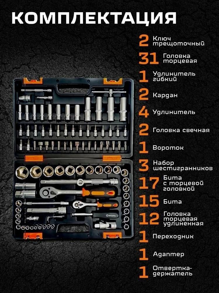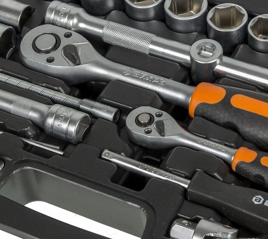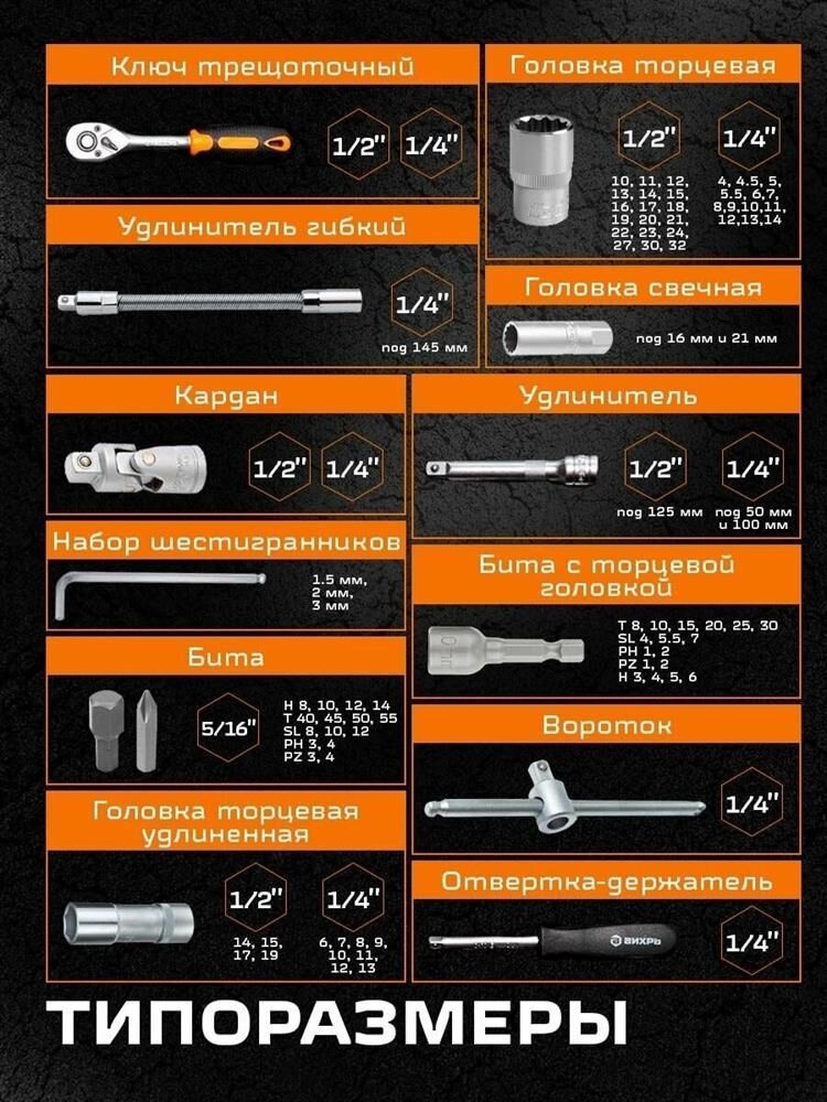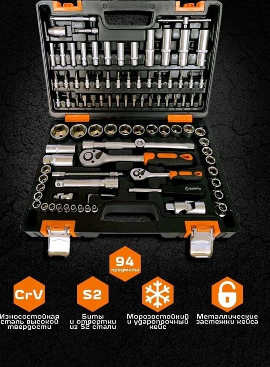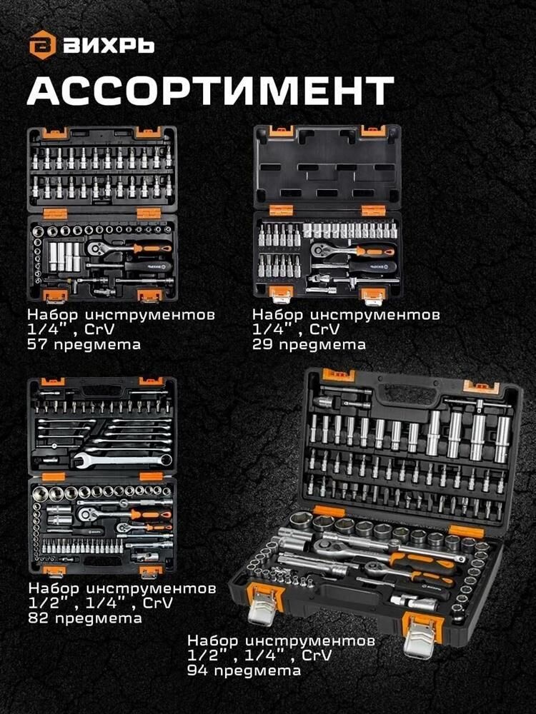 Набор инструментов Вихрь 1/2", 1/4", CrV, пластиковый кейс 94 предмета. Биты Ph; биты Pz; биты SL; биты HX; биты Torx. Ключ трещоточный 1/2"; 1/4". Удлинитель гибкий 1/4" под ключ: 145 мм. Кардан 1/2"; 1/4". Удлинитель 1/2" 125 мм.; 1/4" 50 мм, 100 мм. Головки свечные под ключ 16 мм и 21 мм. Вороток 1/2" и 1/4". Набор шестигранников 1.5 мм, 2 мм, 2.5 мм. Переходник 1/2" четырёхгранника на шестигранник H 5/1.