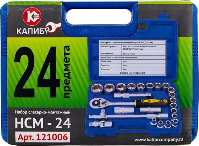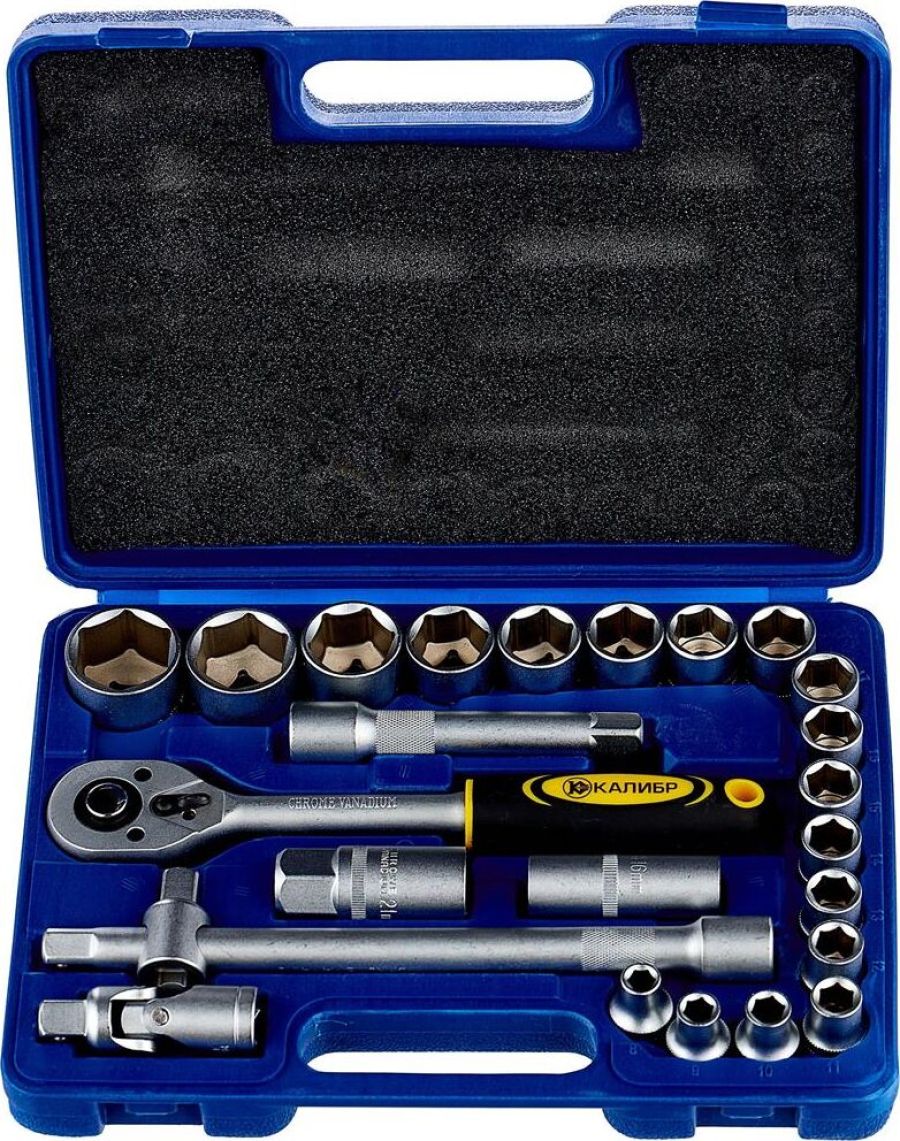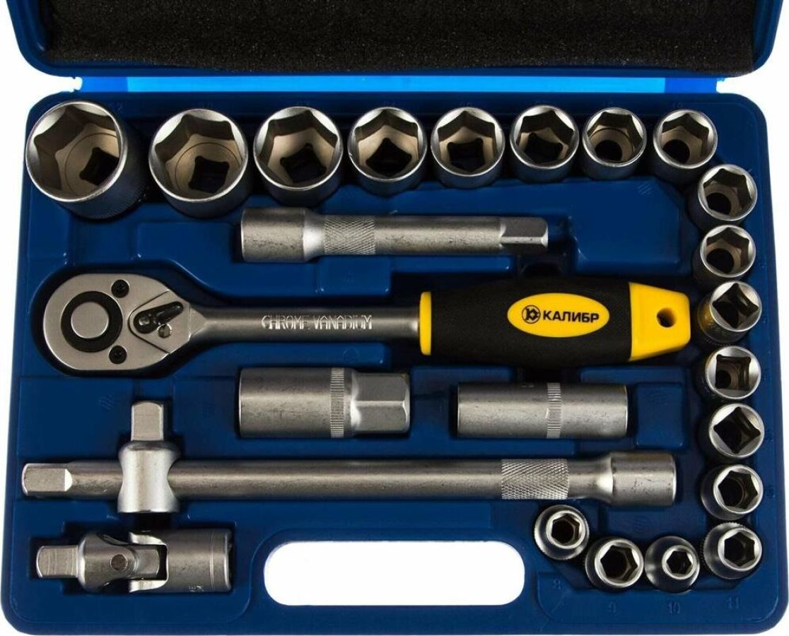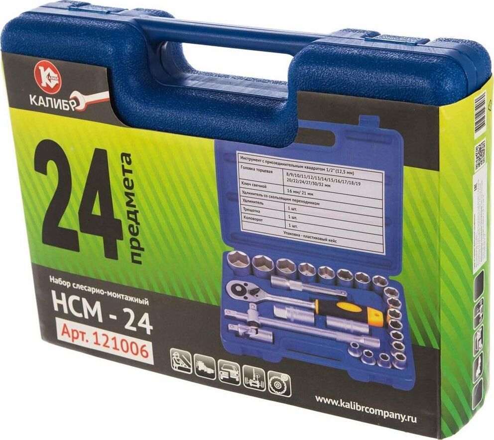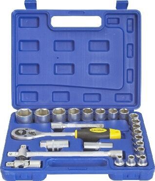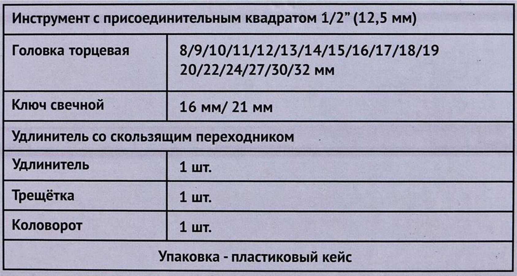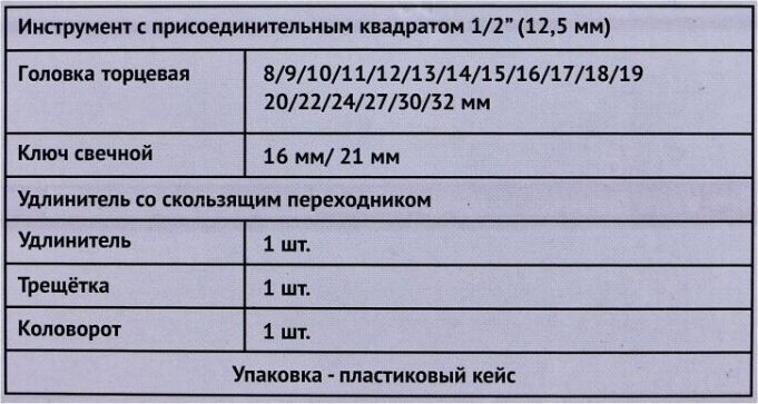 В набор входит: Инструмент с присоединительным квадратом 1/2” (12,5 мм) 1 шт Головка торцевая 8/9/10/11/12/13/14/15/16/17/18/19/20/22/24/27/30/32 мм 18 шт Ключ свечной 16 мм/ 21 мм 1 шт Удлинитель со скользящим переходником 1 шт Удлинитель 1 шт Трещотка 1 шт Шарнир карданный 1 шт