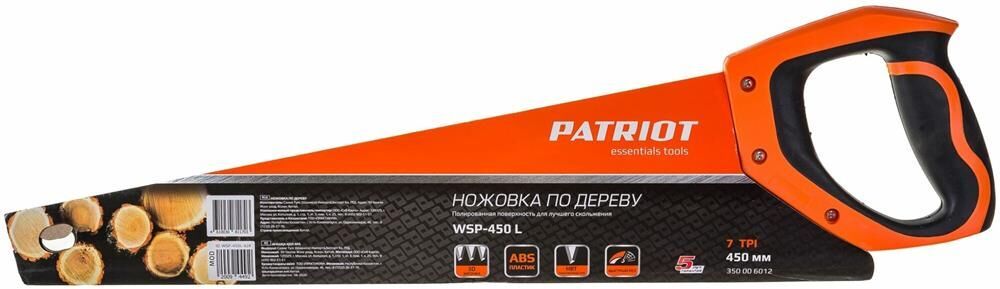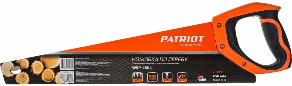 Ножовка PATRIOT WSP-450L, по дереву, 7 TPI крупный зуб, 3-х сторонняя заточка, 450мм