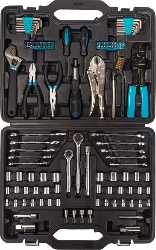 В КОМПЛЕКТЕ Ключ шестигранный (16 шт) Держатель для бит 170 мм с трещеткой (1 шт) Бита 25 мм (40 шт) Ключ разводной (1 шт) Тонкогубцы (1 шт) Бокорезы (1 шт) Манометр (1 шт) Металлическая щетка (1 шт) Пинцы 7" (1 шт) Отвертка (2 шт) Приспособление для зачистки проводов (1 шт) Ключ гаечный (10 шт) Рукоятка с трещеткой квадрат 1/4 (1 шт) Рукоятка с трещеткой квадрат 3/8 (1 шт) Торцевая головка квадрат (40 шт) Удлинитель квадрат 1/4 3 (1 шт) Удлинитель квадрат 3/8 3 (1 шт) Удлинитель квадрат 3/8 6 (1 шт) Свечной ключ квадрат 3/8 16мм (1 шт) Свечной ключ квадрат 3/8 21 мм (1 шт).