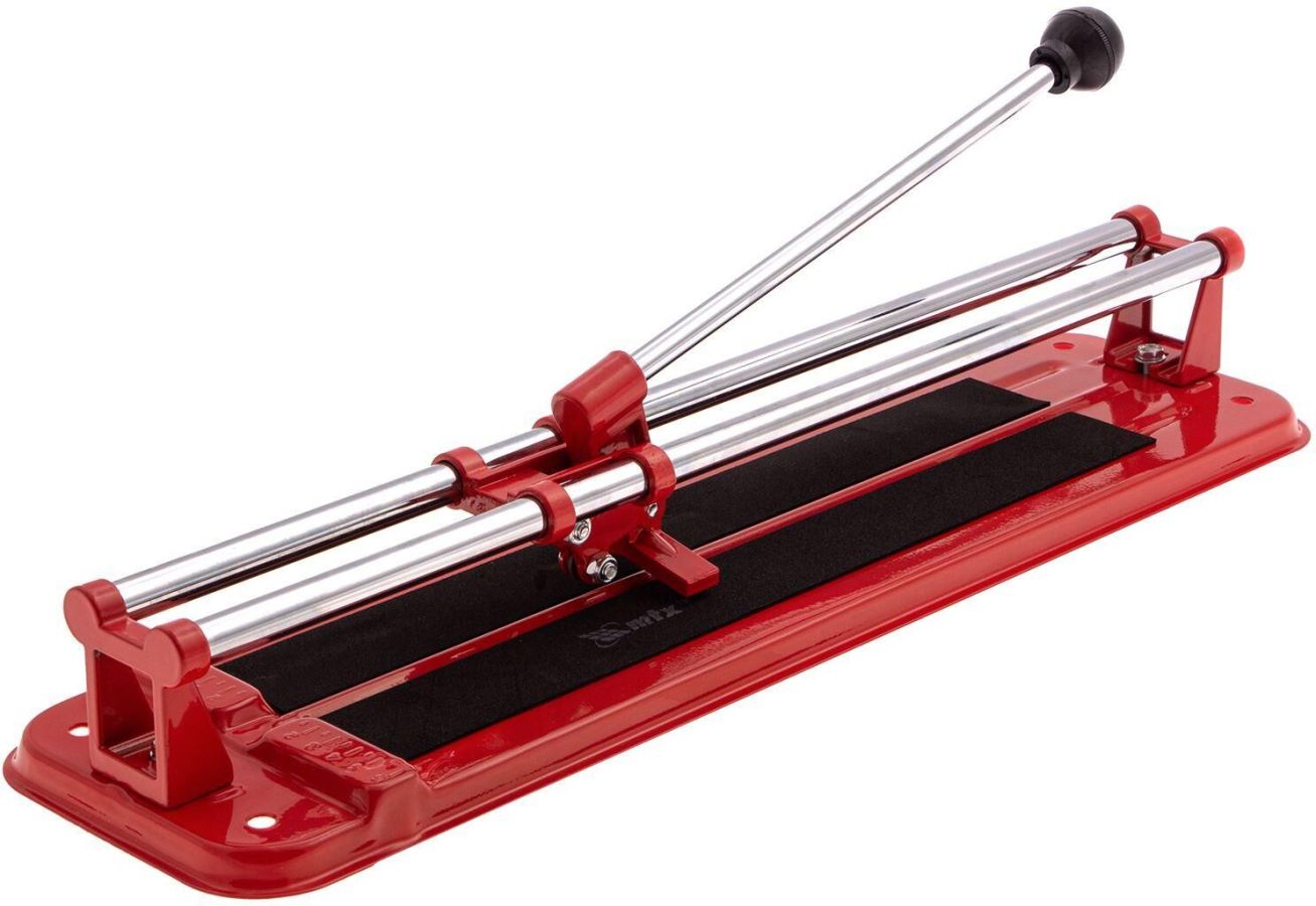 Плиткорез MTX 87619 — инструмент для работы с керамической плиткой размером до 400 х 12 мм. Упрощает и ускоряет резку, позволяет получать ровный и аккуратный срез. Преимущества Высокий ресурс — режущий ролик изготовлен из твердосплавного материала ВК-8. Возможность фиксации на поверхности рабочего стола — в основании плиткореза имеются специальные отверстия. Плавный ход — каретка свободно передвигается благодаря двум направляющим из высококачественной инструментальной стали с антикоррозийным покрытием. Высокое качество работы — стальное основание обеспечивает устойчивость плиткореза, мягкие амортизирующие накладки предотвращают смещение плитки. Комфортная работа — на рукоятке имеется специальный захват.