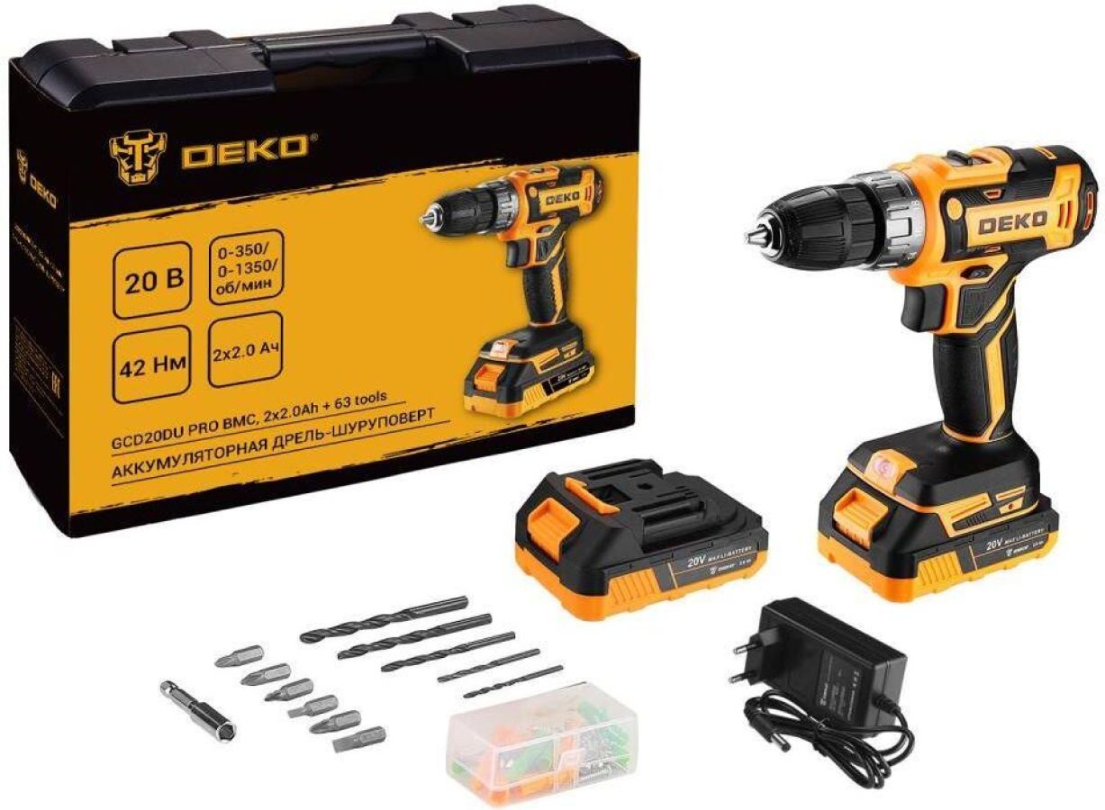 Аккумуляторная дрель-шуруповерт DEKO GCD20DU PRO BMC, 2x2.0Ah + 63 tools используется при строительных, слесарно-монтажных работах. Помогает быстро высверливать отверстия нужного диаметра как на деревянной, так и металлической поверхности, быстро вкручивать или извлекать крепеж. Технические характеристики: Макс. диаметр сверления дерево/металл: 28/10 мм Размер зажимаемой оснастки: 0,8-10 мм Число ступений крутящего момента: 18+1 Макс. крутящий момент: 42 Нм Комплектация: 1 шт дрель-шуруповерт 2 шт АКБ 1 шт зарядное устройство 6 шт сверла 6 шт биты 1 шт магнитный держатель бит 50 шт набор крепежа 1 шт руководство по эксплуатации 1 шт кейс