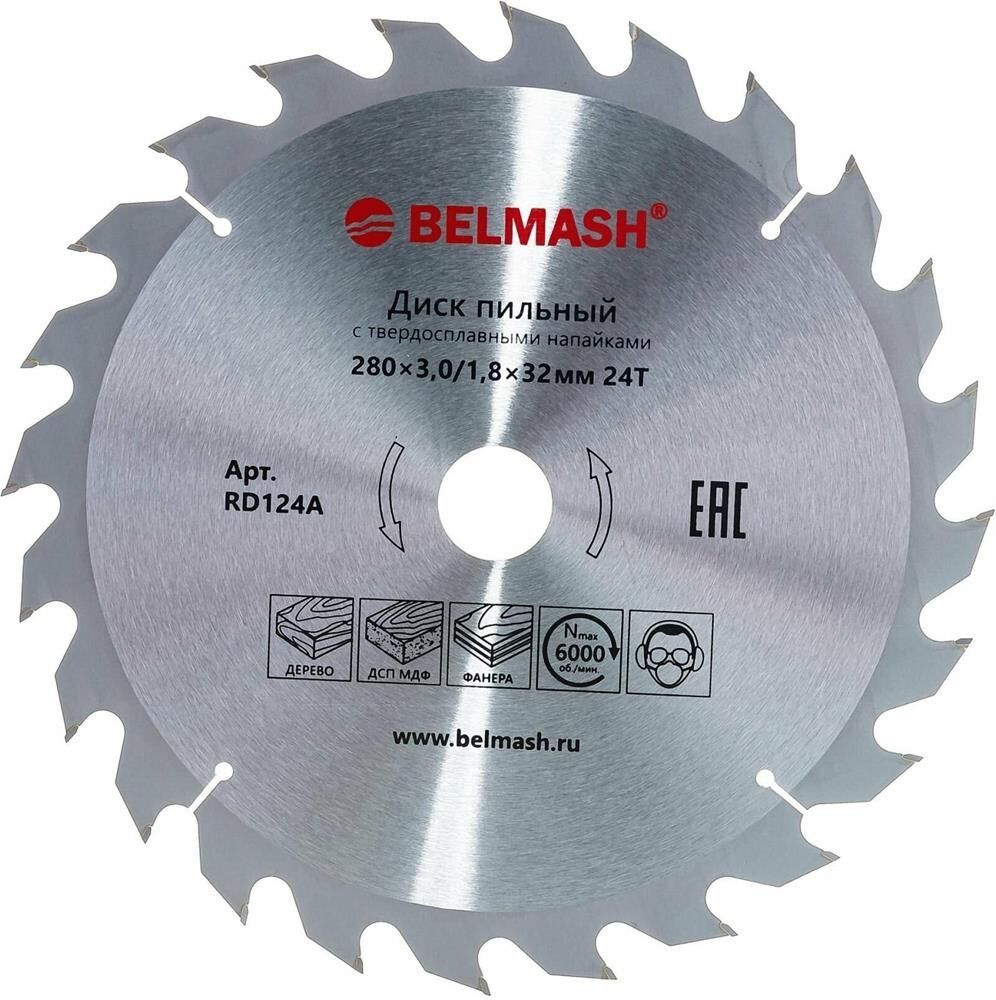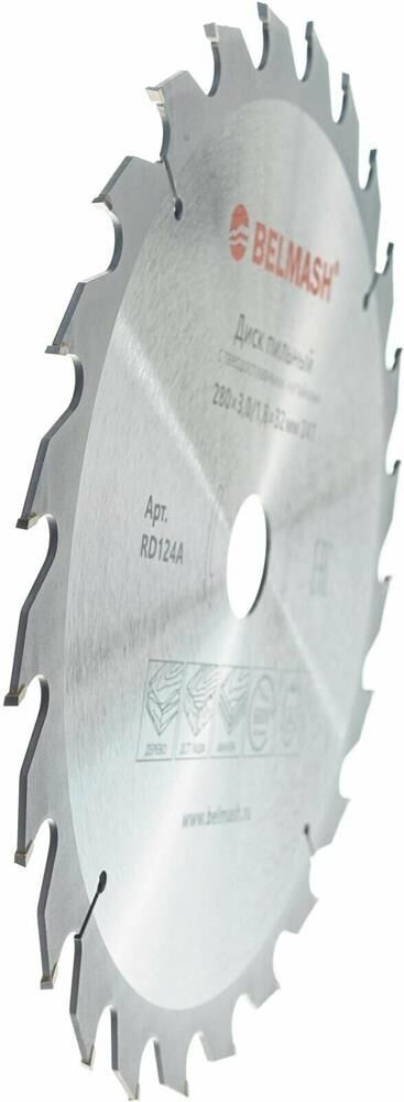 Диск пильный BELMASH 280x3,0/1,8x32/30, 24T с твердосплавными напайками, которые делают зубья износостойкими, способными сопротивляться повышенным ударным нагрузкам. Назначение: для деревообрабатывающих многофункциональных, циркулярных, форматно-раскроечных станков, дисковых и торцовочных пил и т. п. Можно устанавливать на станки BELMASH: СДМ-2200, SDM-2200M, CBS-2400, TSB-2000 Градусы заточки: передний угол 15 градусов, задний угол 15 градусов. Тип зуба ATB: переменные зубья с разносторонним углом наклона главной задней поверхности. Максимальная частота вращения – 6000 об./мин. Посадочный диаметр - 32 мм. В комплекте имеется переходное кольцо на внутренний диаметр 30 мм. Применение: быстрый поперечный и продольный распил древесины, фанеры, МДФ, ДСП, ОСП. Диск соответствует требованиям Технического регламента Таможенного Союза 010/2011 «О безопасности машин и оборудования».