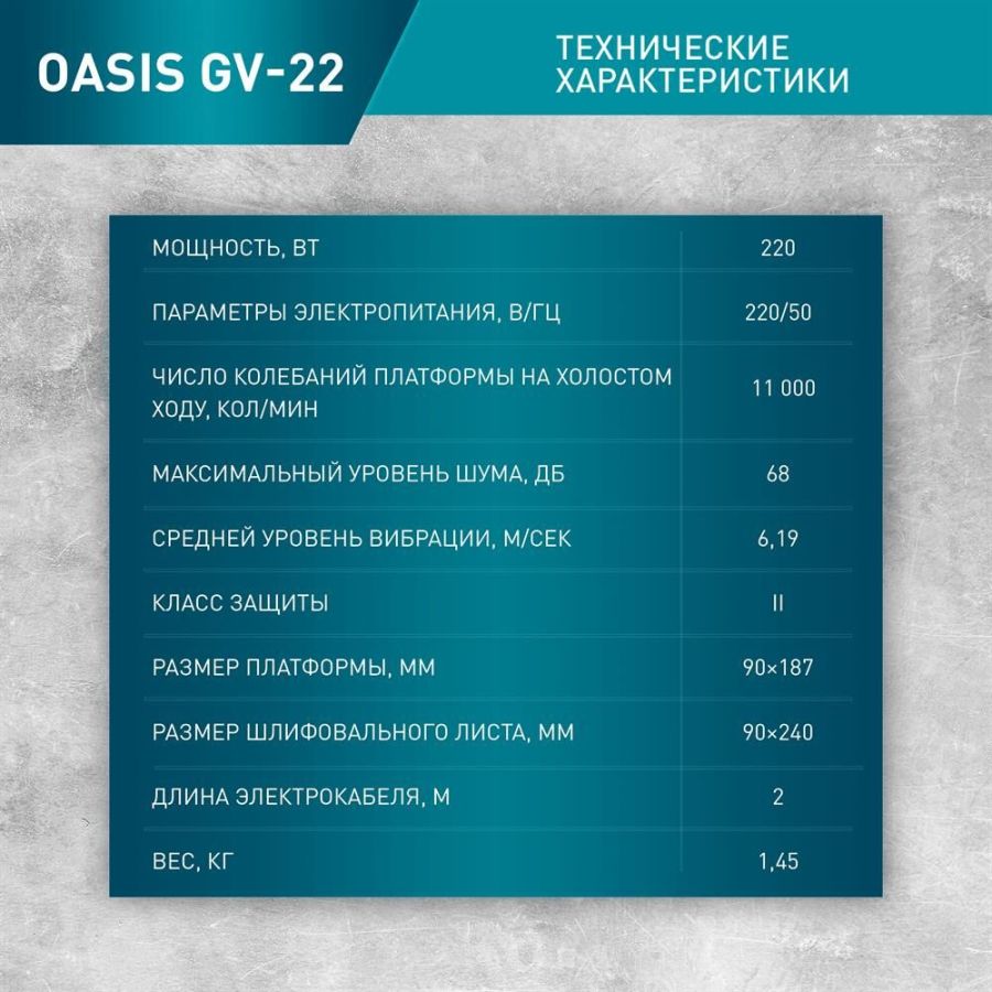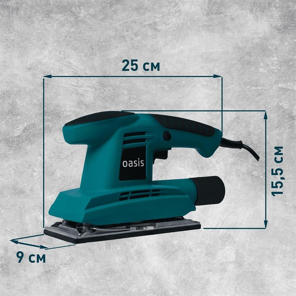 Мощность, Вт 220. Параметры электропитания, В/Гц 220/50. Число колебаний платформы на холостом ходу, кол/мин 11000. Размер платформы, ШхД мм 90x187. Размер шлифовального листа, мм 90х240. Размеры изделия, см 25х9х15,5. Вес нетто, кг 1,54.