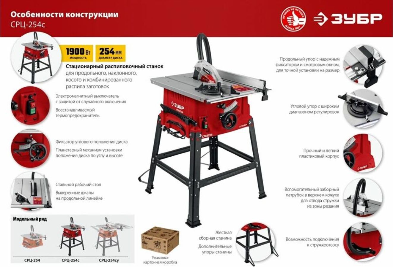 Комплект поставки: пылеотводный шланг, распиловочный станок, кожух защитный, продольная направляющая в сборе, упор угловой, ключ гаечный, резиновые опоры, станина с креплением, толкатель подачи заготовки , Модификация (код производителя): СРЦ-254с , Функции и возможности: подключение пылесоса