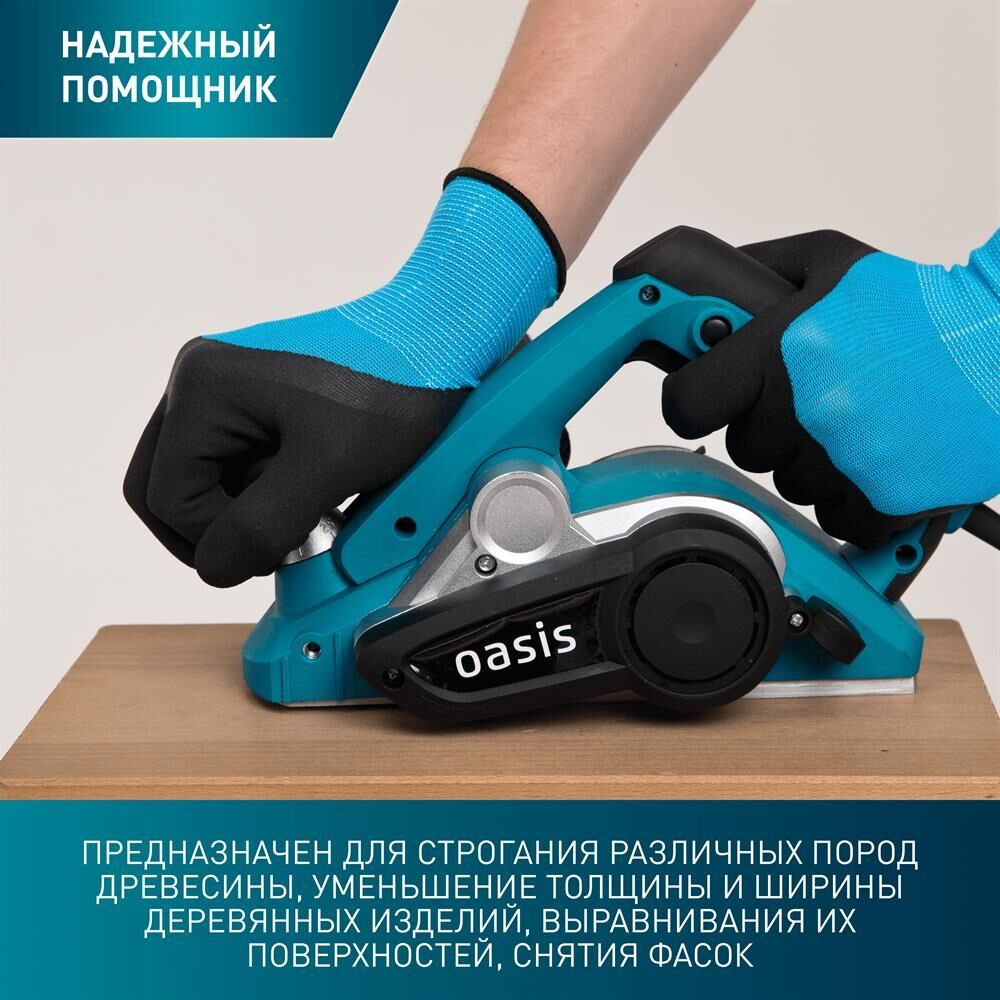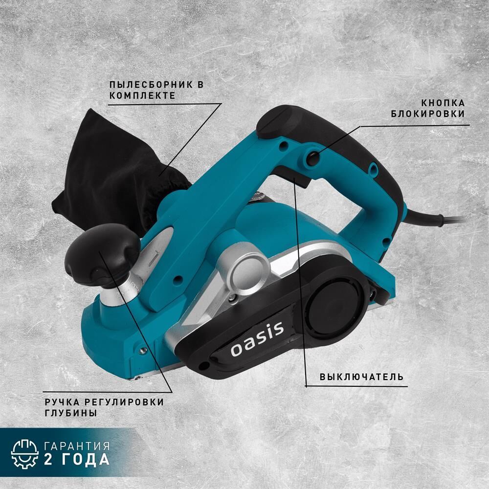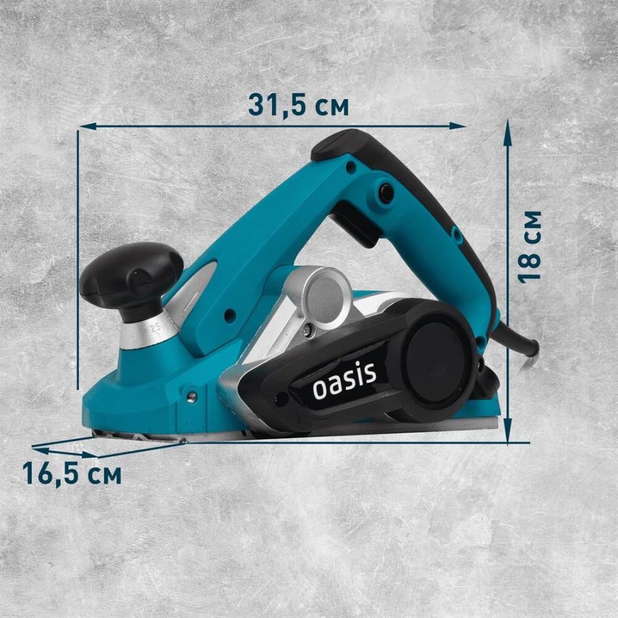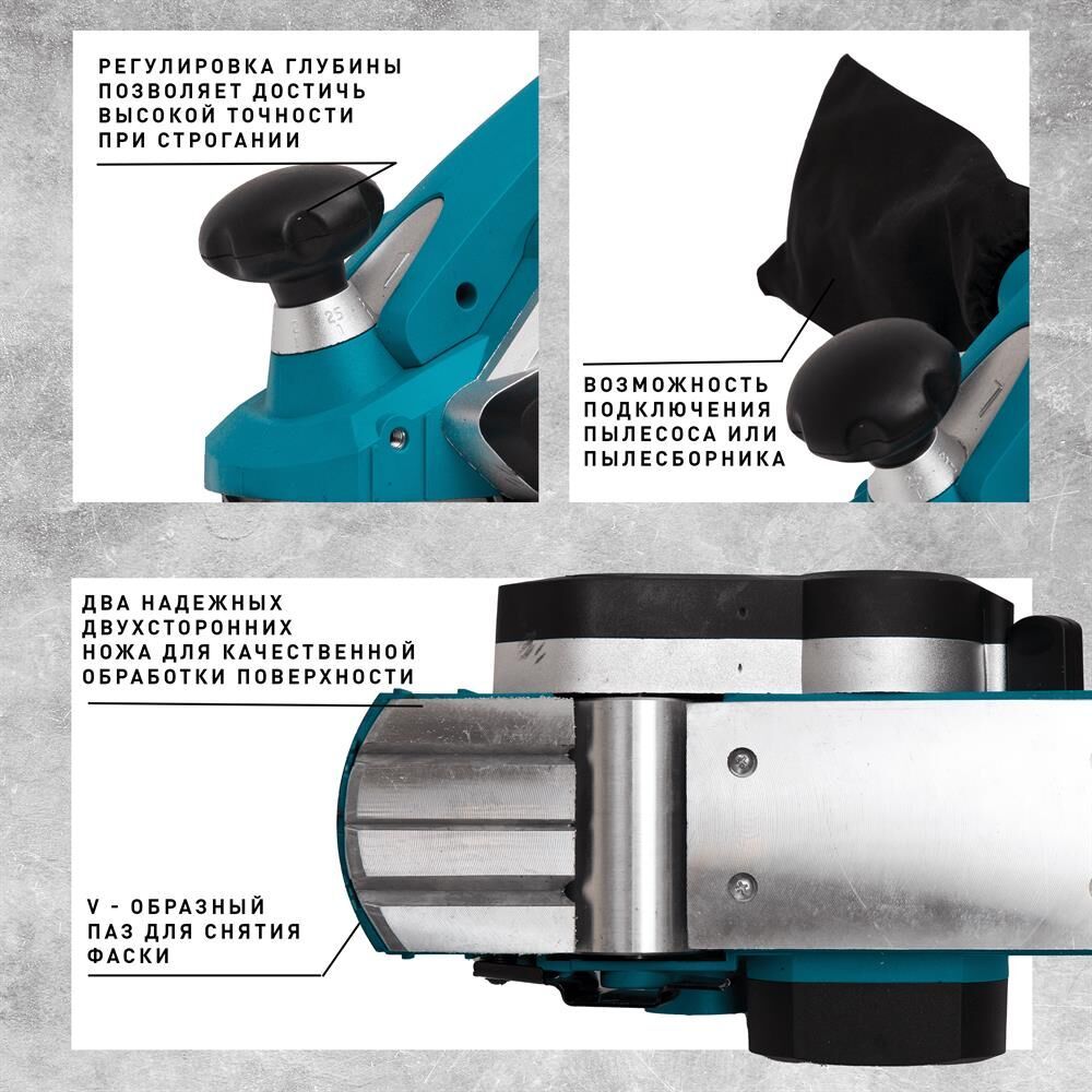Мощность, Вт 1100. Параметры электропитания, В/Гц 220/50. Скорость вращения шпинделя на холостом ходу, об/мин 16000. Ширина строгания за один проход, мм 82. Максимальная глубина строгания, мм 3. Размеры изделия, см 31,5х16,5х18. Вес нетто, кг 2,78.