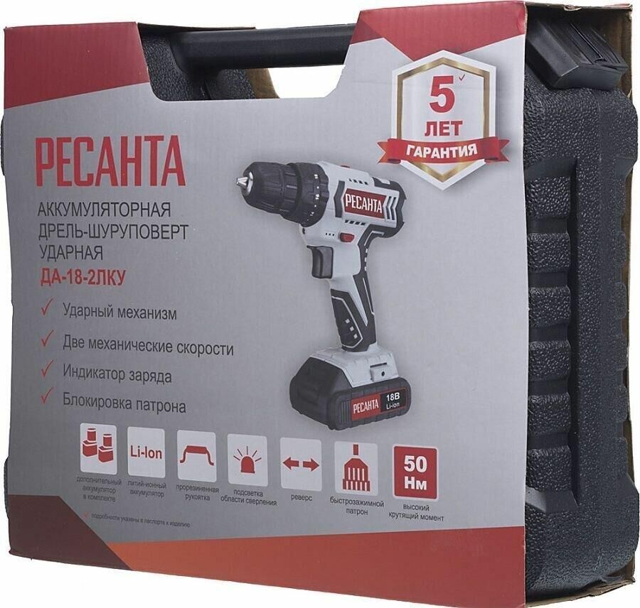 Тип: Дрель-шуруповерт Вид питания: Сменный аккумулятор Напряжение аккумулятора: 18 В Тип аккумулятора: Li-ion Количество аккумуляторов в комплекте: 2 Функциональные особенности: Блокировка от случайного включения Тип патрона: Быстрозажимной Крутящий момент, Нм50 Режимы работы: Завинчивание, Сверление