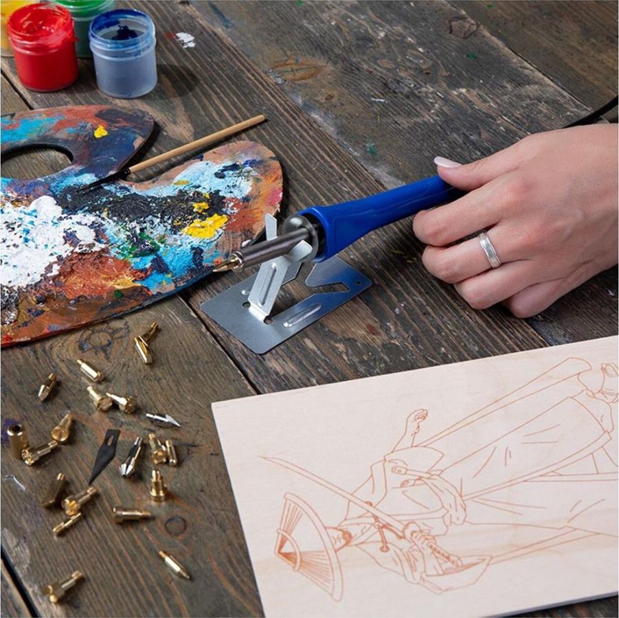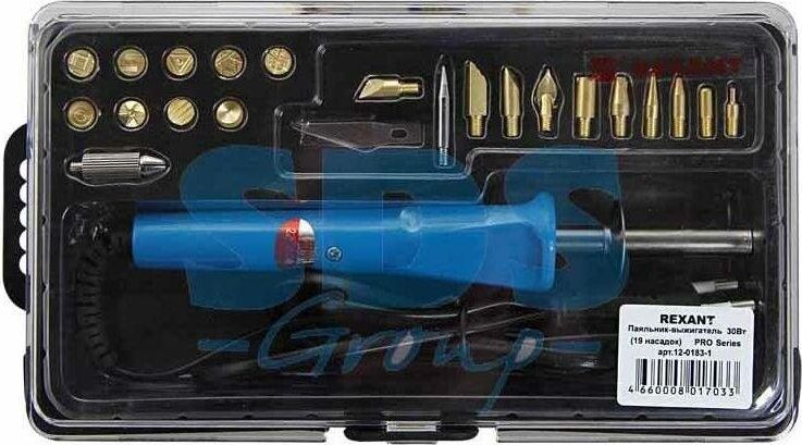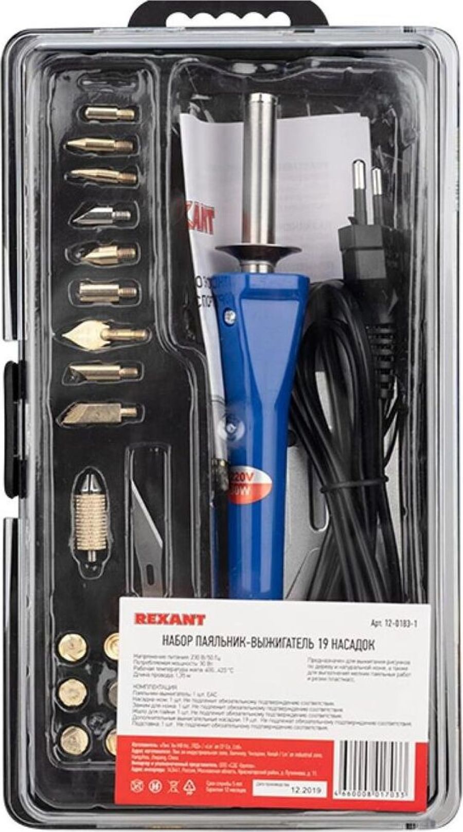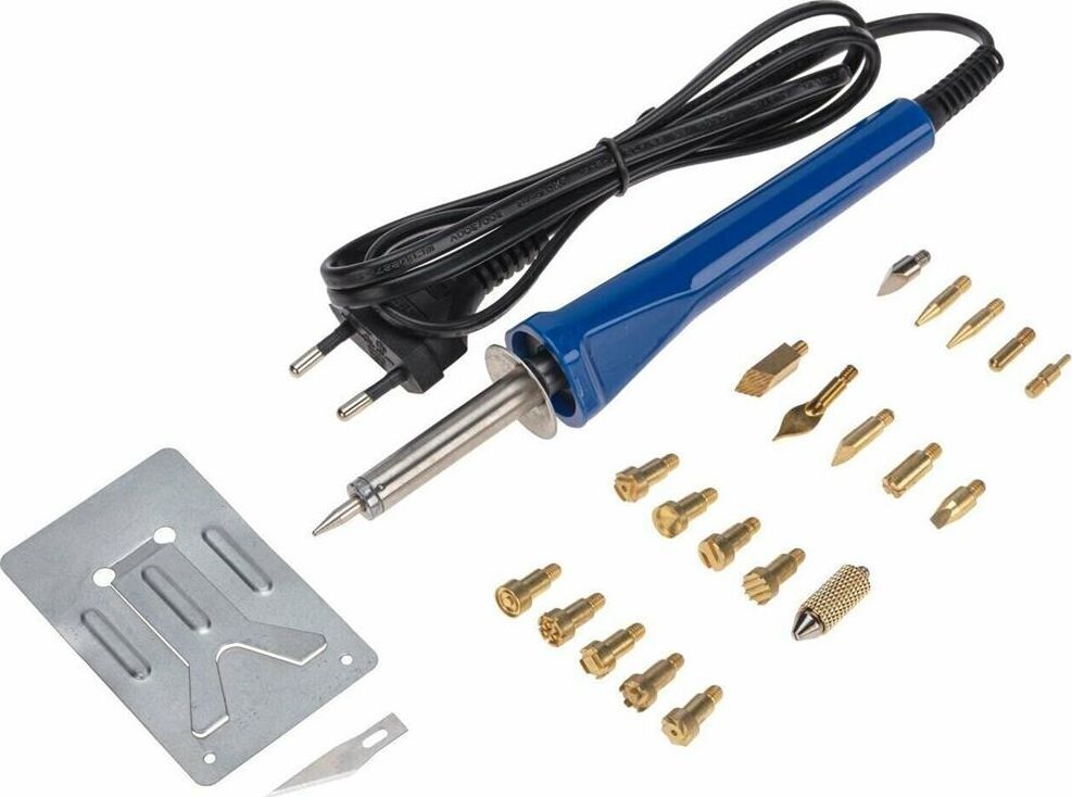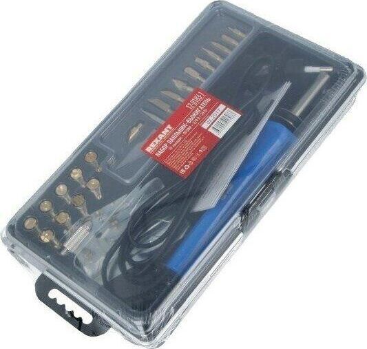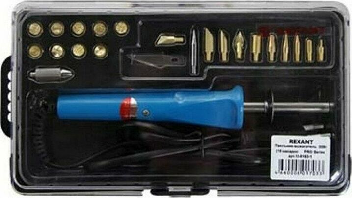 Выжигатель REXANT (набор паяльник-выжигатель), 21 насадок, подставка, 230 В/30 Вт – отличное решение для тех, кто стремится по максимуму использовать полезные приборы. Суть работы паяльников и выжигателей по дереву очень схожа, на этом и основано действие прибора. Благодаря 19 различным насадкам его можно сделать как паяльником, так и выжигателем. Основные характеристики: Напряжение питания, В: 230 Мощность, Вт: 30 Диапазон температур нагрева (?): 400…450 Время разогрева (в минутах): 5-8 Установочный диаметр жала, мм: 4 Комплектация: Паяльник-выжигатель: 1 шт. Жало для пайки: 1 шт. Насадка-нож: 1 шт. Цанговый зажим: 1 шт. Выжигательные насадки: 19 шт. Подставка: 1 шт. С помощью этих насадок можно создавать красивые картины, выжигая на дереве различные узоры, выполнять выжигание на коже или резать пластмассу. Все насадки закрепляются с помощью винта. Для удобства пользования и транспортировки набор поставляется в пластиковом боксе.