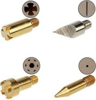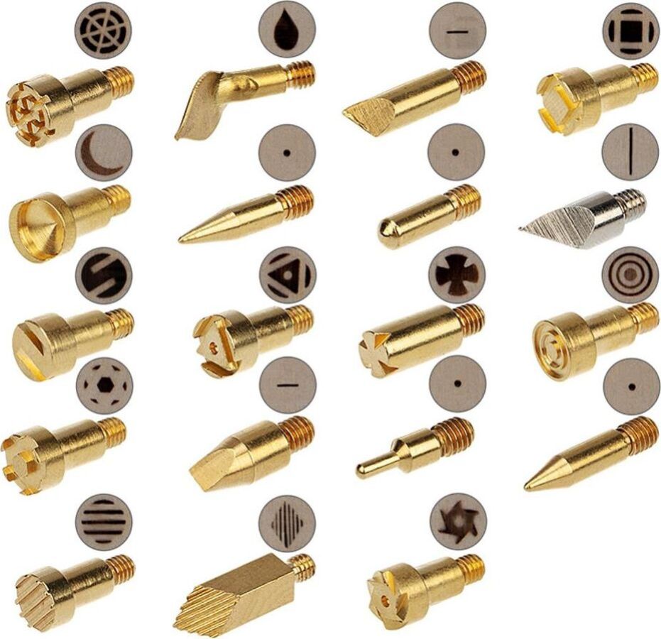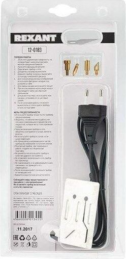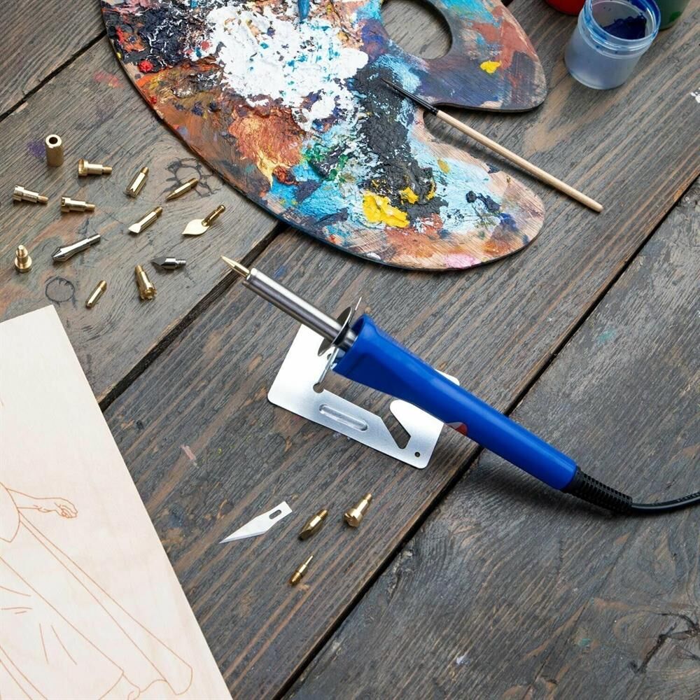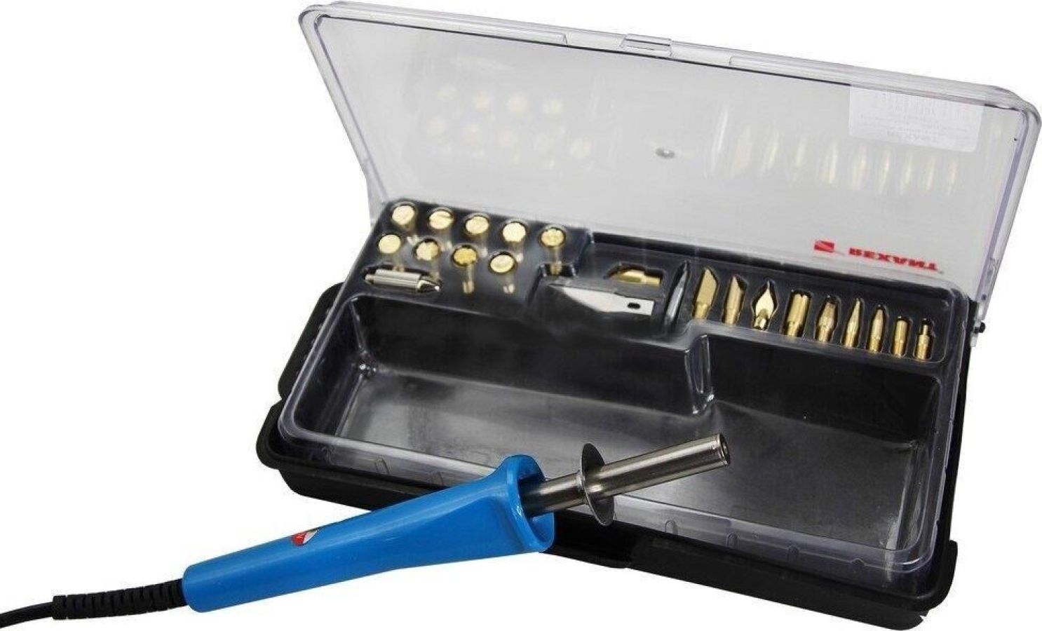 Выжигатель REXANT (набор паяльник-выжигатель), 21 насадок, подставка, 230 В/30 Вт – отличное решение для тех, кто стремится по максимуму использовать полезные приборы. Суть работы паяльников и выжигателей по дереву очень схожа, на этом и основано действие прибора. Благодаря 19 различным насадкам его можно сделать как паяльником, так и выжигателем. Основные характеристики: Напряжение питания, В: 230 Мощность, Вт: 30 Диапазон температур нагрева (?): 400…450 Время разогрева (в минутах): 5-8 Установочный диаметр жала, мм: 4 Комплектация: Паяльник-выжигатель: 1 шт. Жало для пайки: 1 шт. Насадка-нож: 1 шт. Цанговый зажим: 1 шт. Выжигательные насадки: 19 шт. Подставка: 1 шт. С помощью этих насадок можно создавать красивые картины, выжигая на дереве различные узоры, выполнять выжигание на коже или резать пластмассу. Все насадки закрепляются с помощью винта. Для удобства пользования и транспортировки набор поставляется в пластиковом боксе.