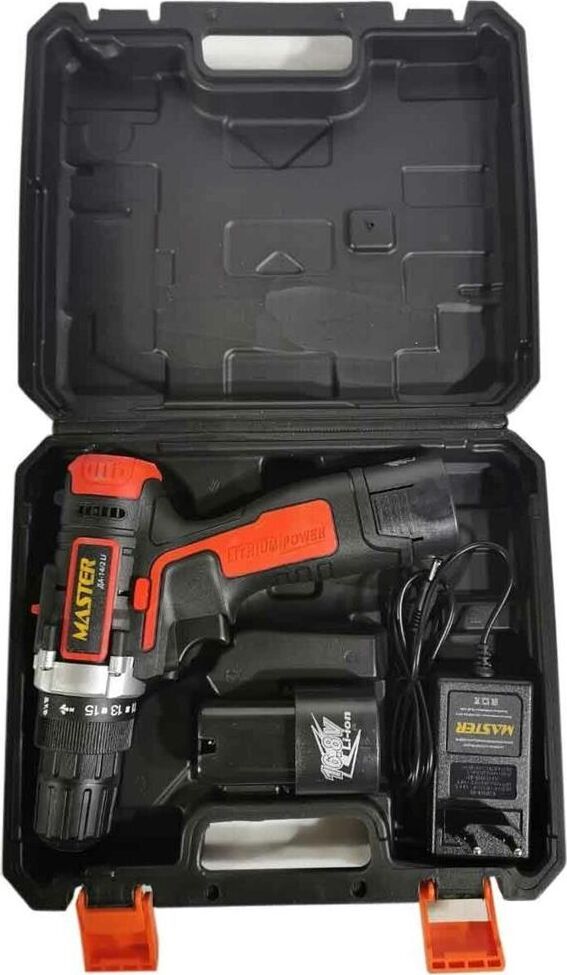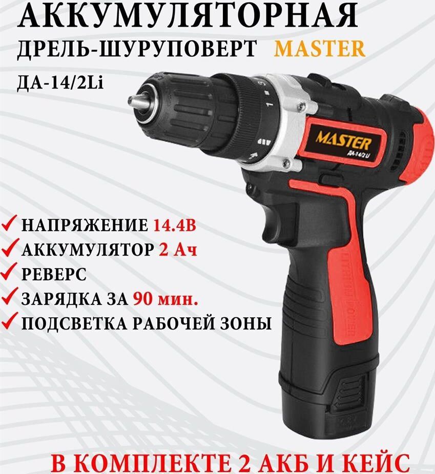 Дрель шуруповёрт аккумуляторная "MASTER" ДА-14/2LI Напряжение аккумулятора 14,4 B Емкость аккумулятора 2.0 Ач Количество скоростей 2 1 скорость: 0-400 об/мин., 2 скорость: 0-1400 об/мин Максимальный крутящий момент 35 Hм Диаметр патрона 10 мм Количество аккумуляторов в комплекте 2 Зарядка: 90 мин.,Реверс: есть Прорезиненная рукоятка Тип патрона быстрозажимной Упаковка: кейс