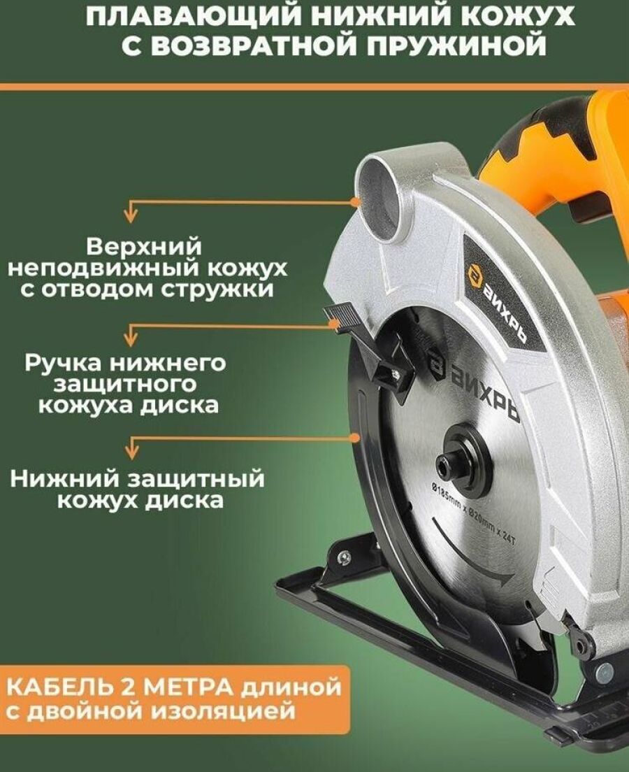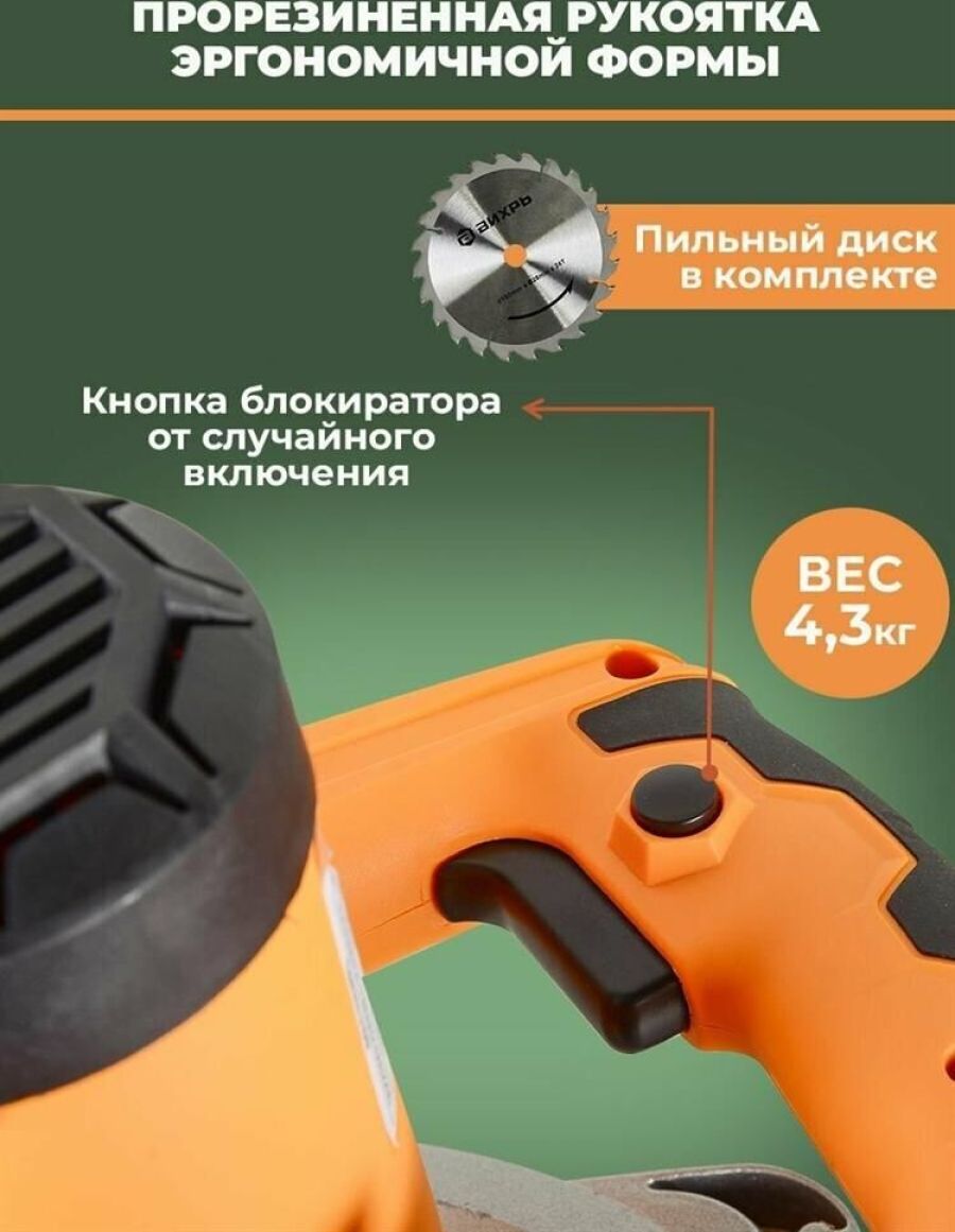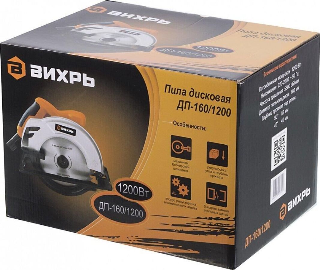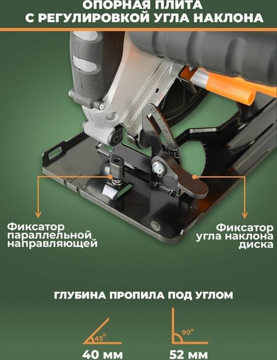 Класс товара Бытовой. Мощность, Вт 1200. Диаметр, мм 160. Посадочный диаметр диска, мм 20. Регулировка оборотов нет. Max глубина пропила под углом 90°, мм 52. Плавный пуск нет. Поддержание постоянных оборотов под нагрузкой нет. Длина кабеля, м 2. Мини-пила нет. Наличие патрубка для подключения пылесоса нет. Возможность работы с направляющей шиной есть. Вес нетто, кг 4,3. Габариты без упаковки, мм 502х315х510. Число оборотов, об/мин 5500. Max глубина пропила под углом 45°, мм 40.