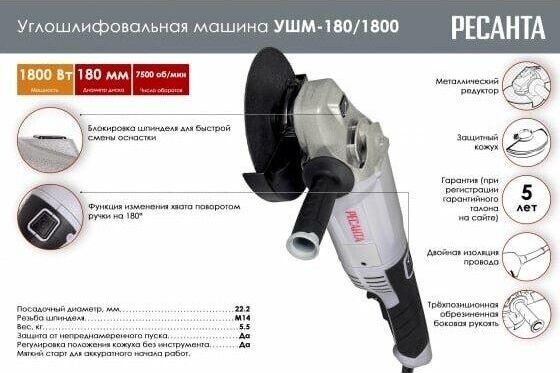 Напряжение, В 220. Мощность, Вт 1800. Диаметр диска, мм 180. Посадочный диаметр, мм 22.2. Число оборотов, об/мин 7500. Электр. регулировка оборотов нет. Защита от непреднамеренного пуска да. Регулировка положения кожуха без инструмента да. Наличие виброручки нет. Плавный пуск да. Комплектация коробка. Вес нетто, кг 5,5. Габариты без упаковки, мм 320x260x480. Тип двигателя щеточный. Диск в комплекте нет. Резьба шпинделя М14.