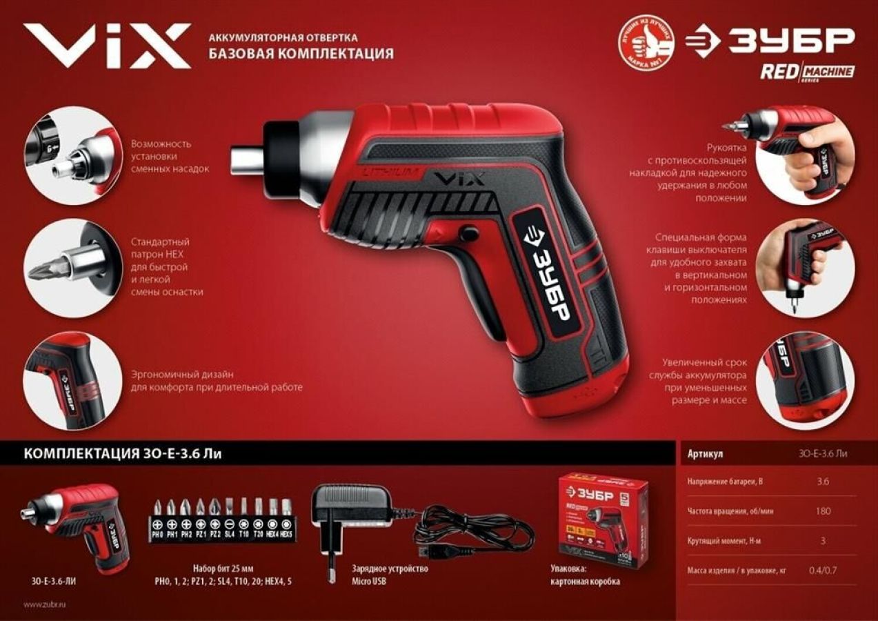 Срок службы: 12 мес., Использовать при температуре не ниже -10 градусов , Гарантийный срок: 1 г., Гарантия на аккумулятор — 6 месяцев , Комплектация: зарядное устройство, инструкция, 10 бит (PH0, PH1, PH2, PZ1, PZ2, S4, T10, T20, HEX4, HEX5) , Тип аккумулятора: Li-Ion , Количество аккумуляторов в комплекте: 1 , Реверс: есть
