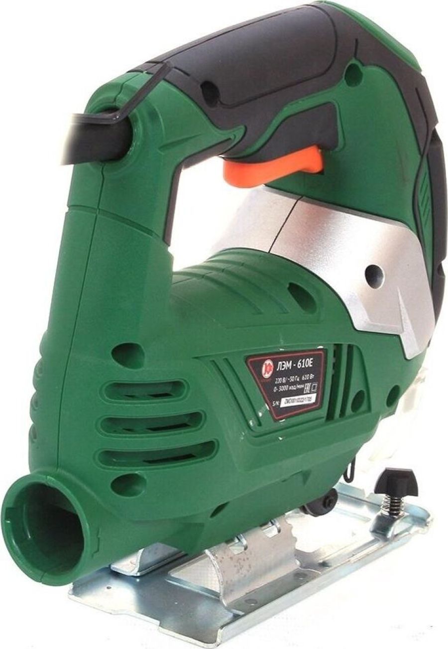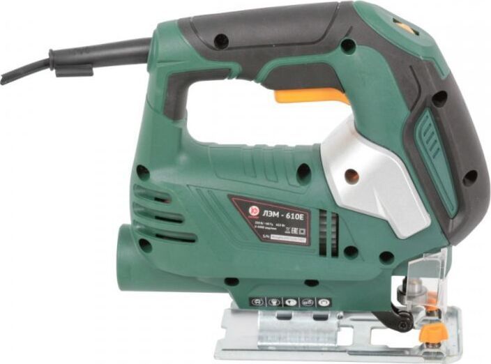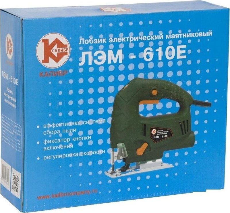Ручной электрический маятниковый лобзик Калибр ЛЭМ-610Е с регулировкой скорости предназначен для прямолинейного и фигурного пиления дерева, пластмассы,чёрных и цветных металлов и других строительных материалов в быту,Регулировка скорости хода; Переходник для подключения пылесоса; Кожух защитный пластмассовый; Кнопка фиксации клавиши выключателя; Регулировка угла наклона; Маятниковый ход,Характеристики,Потребляемая мощность 610 Вт,Скорость хода пильного полотна без нагрузки 0-3000 ход/мин,Величина хода пилки 18 мм,Угол наклона резки +/- 450,Максимальная глубина пропила: дерево 65 мм,сталь 4 мм,цветной металл 10 мм,Уровень звукового давления 89 дБ(А),Длина шнура питания, не менее 2 м,Электродвигатель,Однофазный коллекторный,Функция маятникового движения,4-е положения,Номинальное напряжение/Частота 230 В/50 Гц,Габариты в упаковке (ДхШхВ) 255х82х225 мм,Вес (брутто/нетто) 2,0/1,8 кг