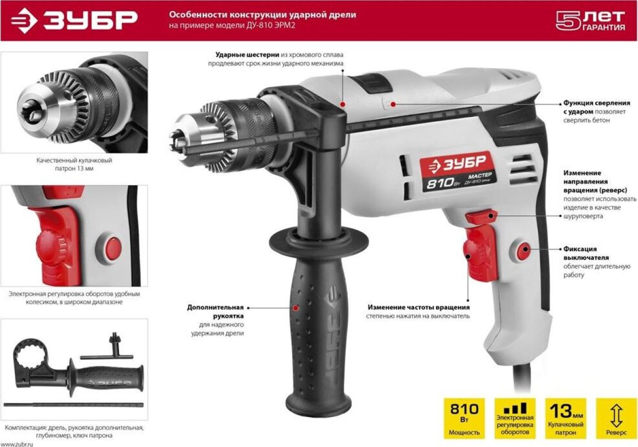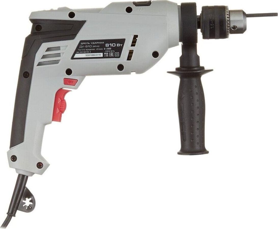 Мощность, Вт 810 Макс. число оборотов холостого хода, об/мин 0-2800 Частота ударов, уд/мин 0-42000 Макс. диаметр сверления (дерево), мм 20 Макс. диаметр сверления (металл), мм 10 Макс. диаметр сверления (бетон), мм 13 Тип патрона ключевой Диаметр патрона, мм 1.5-13 Посадка патрона, дюйм 1/2 Режимы работы сверление/сверление с ударом Количество скоростей работы 1 Реверс есть Электронная регулировка частоты вращения есть Фиксация кнопки включения есть Ограничитель глубины сверления есть Дополнительная рукоятка есть Диаметр шейки под рукоятку, мм 43 Длина кабеля, м 2