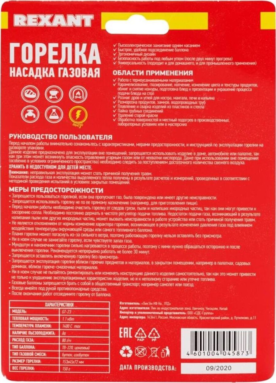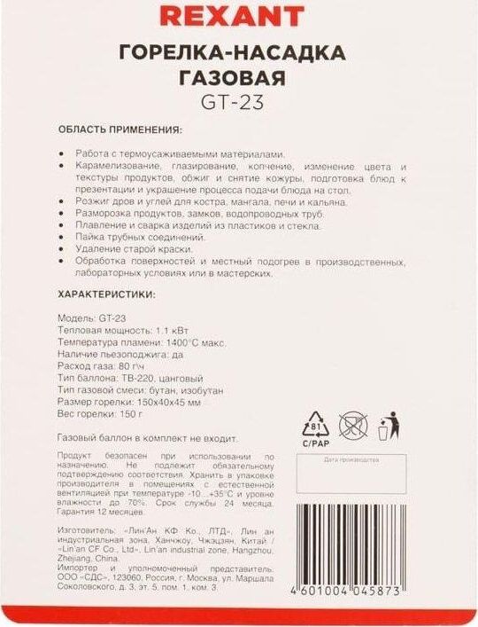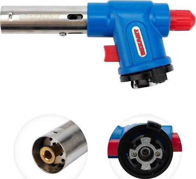 Газовая горелка-насадка, мощность: 1,1кВт 0,946 ккал , температура пламени: 1400 С (макс.), расход газа: 80 гр/ч, тип поджига: встроенный пьезо, материал: медь + нержавеющая сталь + алюминий + сплав цинка + пластик, сфера применения: от плавления и сварки до копчения продуктов, тип газового баллона: ТВ-220 (цанговый).