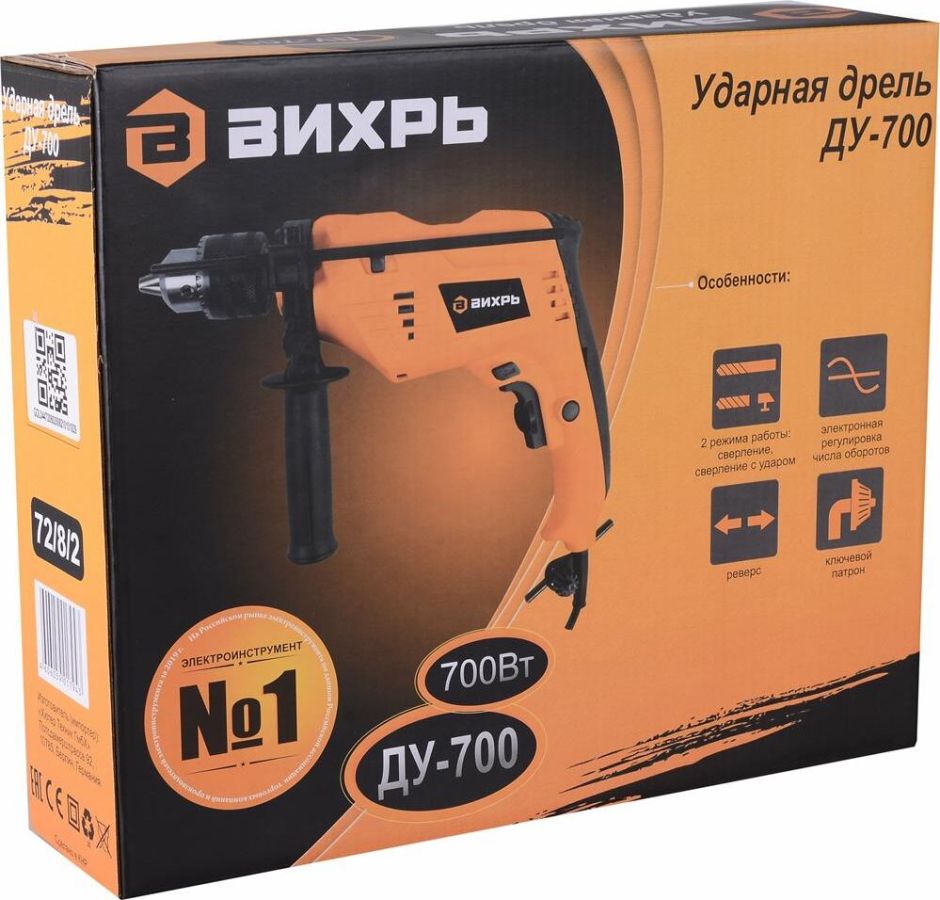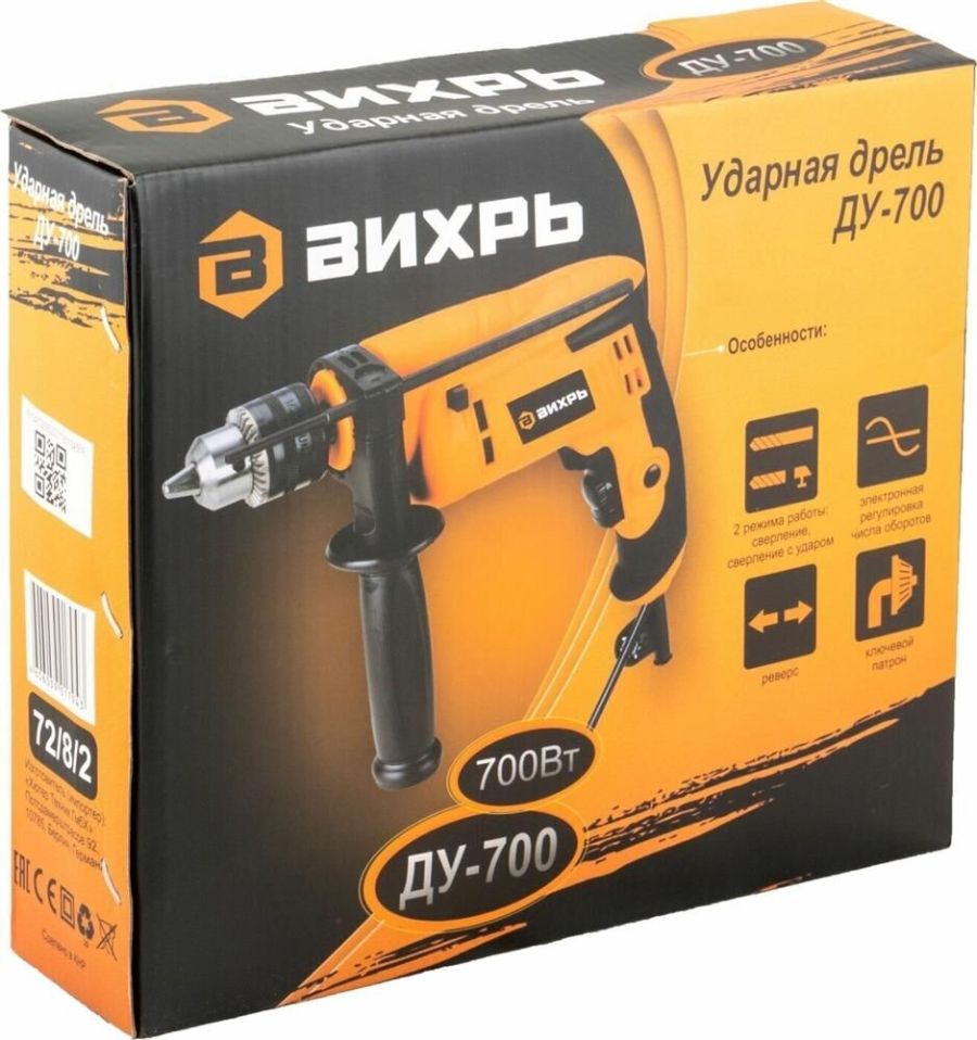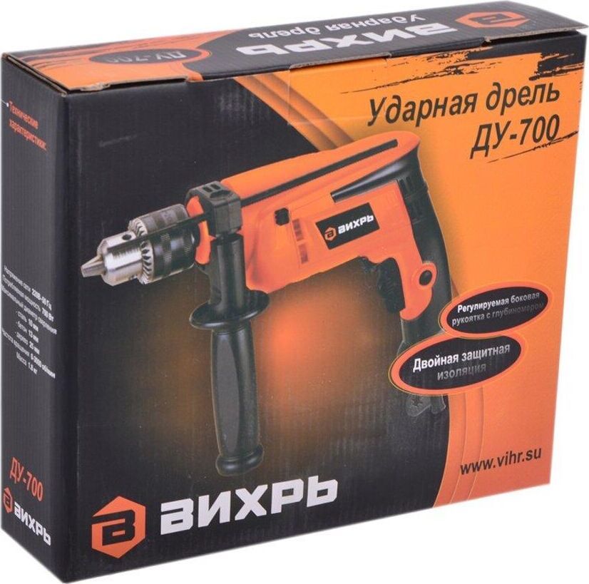 Мощность, Вт 700. Тип патрона ключевой. Число скоростей 1. Регулировка оборотов да. Наличие удара да. Наличие подсветки нет. Наличие реверса да. Max диаметр сверления (металл), мм 10. Мах диаметр сверления (дерево), мм 25. Вес нетто, кг 1,8. Комплектация коробка. Частота вращения шпинделя, об/мин 0-3000. Плавный пуск нет. Мах диаметр сверления (бетон), мм 13.