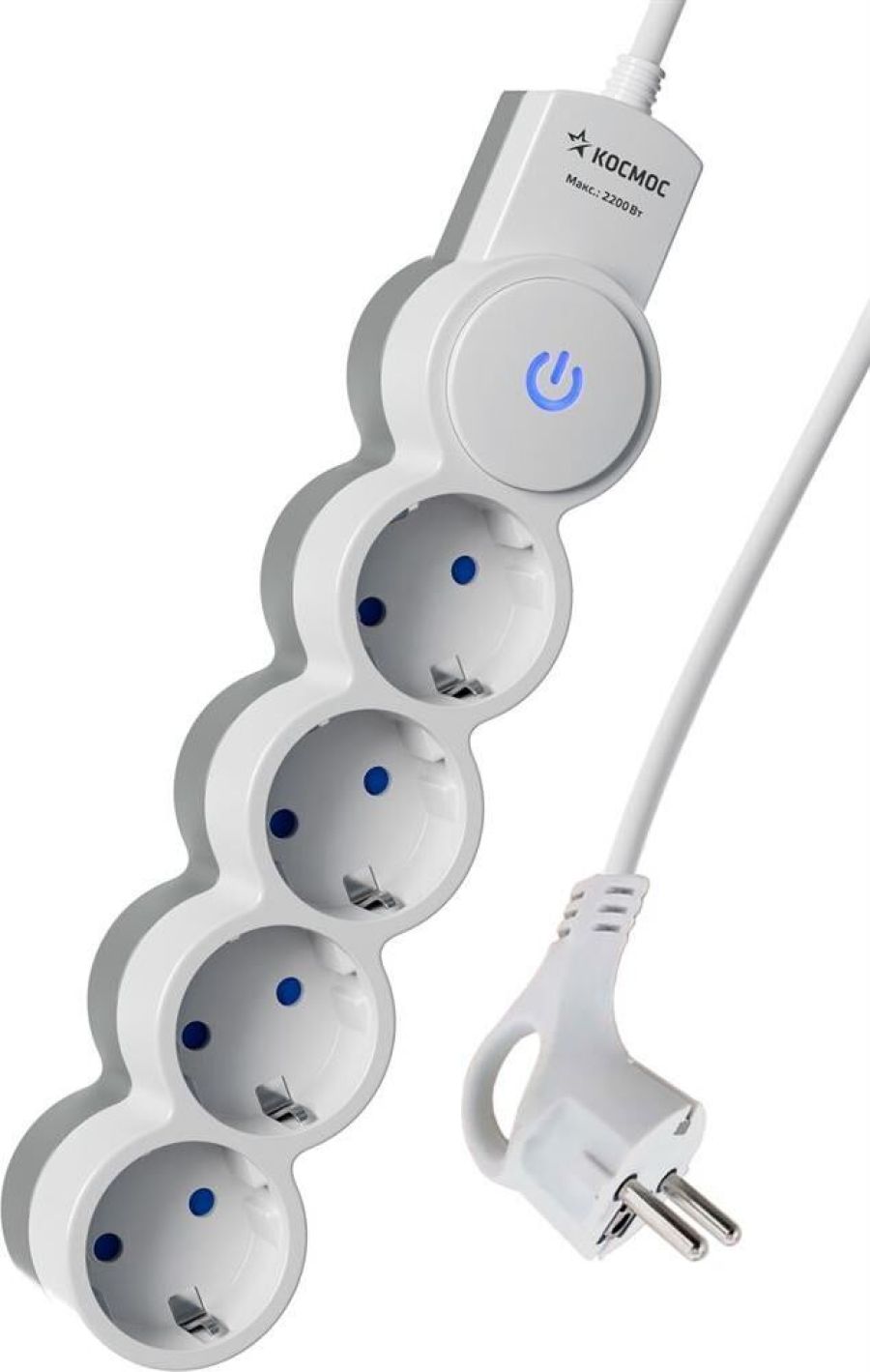 "Бытовой удлинитель белого цвета с кнопкой включения, корпус выполнен из прочного ABS пластика с 4 гнёздами, которые имеют защитные шторки, 10 А, 5м ПВС провод 3х1 мм2, темп. Эксплуатации 1...35 °C, ном. Частота 50 Гц, напряжение 220В, IP20, макс. Мощность 10А 2200 Вт. Китай.