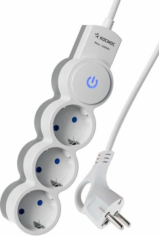 "Бытовой удлинитель белого цвета с кнопкой включения, корпус выполнен из прочного ABS пластика с 3 гнёздами, которые имеют защитные шторки, 10 А, 3м ПВС провод 3х1 мм2, темп. Эксплуатации 1...35 °C, ном. Частота 50 Гц, напряжение 220В, IP20, макс. Мощность 10А 2200 Вт. Китай.