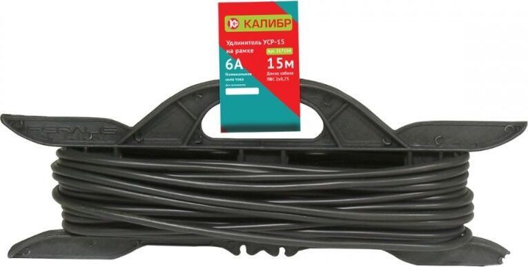 Удлинитель электрический "Калибр УСР-15" на рамке, предназначен для работы в сетях переменного тока напряжением 230±10%, ~50 Гц. При помощи удлинителя легко подключить удалённые от стационарной розетки электроприборы, имеющие шнур с плоской или круглой вилкой. Незаменим - на стройке, садовом участке, в промышленности и в быту. *в зависимости от поставки, внешний вид рамки может отличаться от представленного на фотографии. Сечение 0,75 мм2. Максимальная нагрузка 6 А, 1300 Вт. Длина кабеля 15 м.