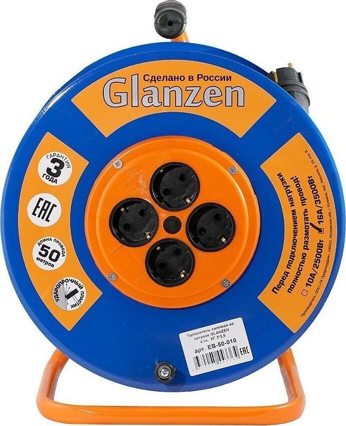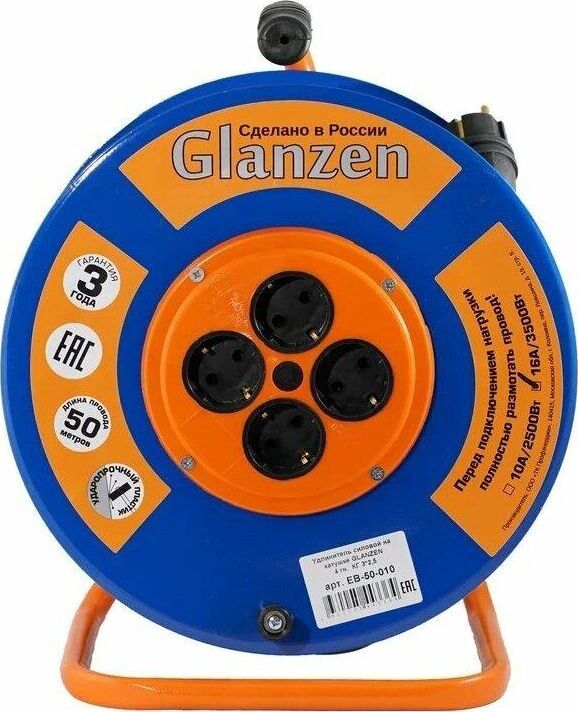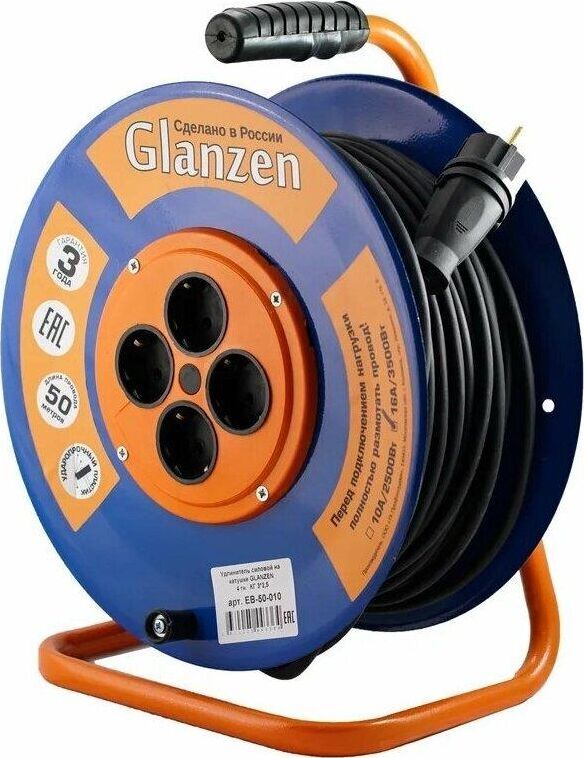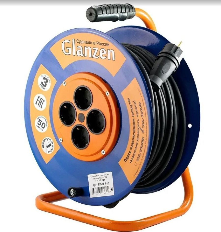 Удлинитель на катушке, 4 розетки с заземлением, металлическая катушка, металлическая тренога; Мощность нагрузки: 3200 Вт Номинальный ток: 16 А Длина провода: 50 метров Вид провода: КГ 3х2,5 Защита: IP44, Рекомендован к применению в промышленных или бытовых целях; Рекомендован к применению в промышленных или бытовых целях. Габаритные размеры: 290х310х380 мм Вес: 6 кг