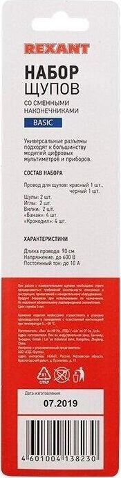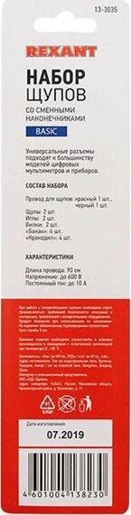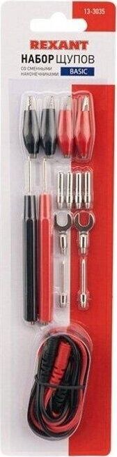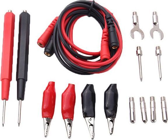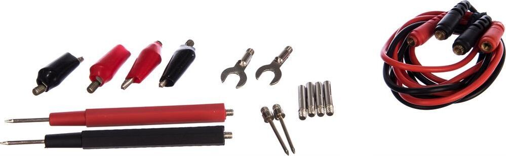 В комплекте: Провод для щупов: красный 1 шт., черный 1 шт. Щупы: 2 шт. Иглы: 2 шт. «вилки»: 2 шт. «банан»: 4 шт., «крокодил»: 4 шт. Длина провода 900 мм Напряжение: до 600 В Постоянный ток: до 10 А Набор со сменными окончаниями. Позволяет самостоятельно собирать два измерительных шнура с необходимыми окончаниями. · Два шнура (красный/черный) длиной ~92 см с резьбовыми адаптерами (внутренняя резьба) · Два изолированных щупа (красный/черный) длиной ~110 мм (внешняя резьба) · Четыре изолированных зажима тип «Aligator» (красный/черный) длиной ~40 мм (внешняя резьба) · Два щупа длиной ~20 мм (внешняя резьба) · Две клеммы тип «U» 6.4 мм (внешняя резьба) · Четыре цанговых клеммы тип «Banana» (внешняя резьба).