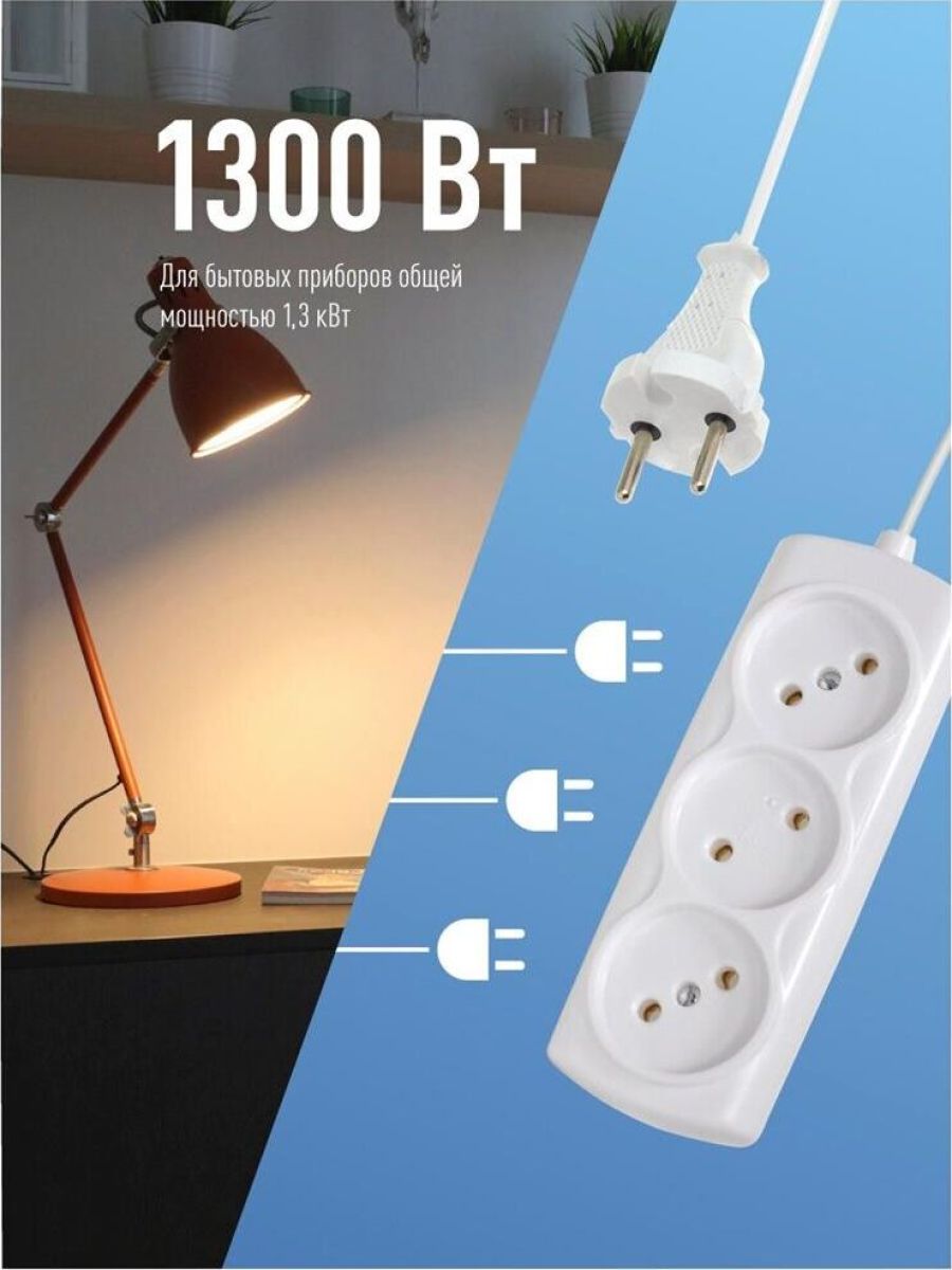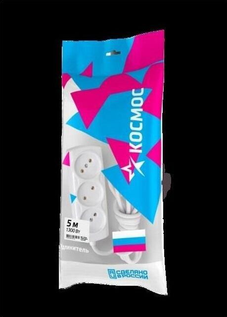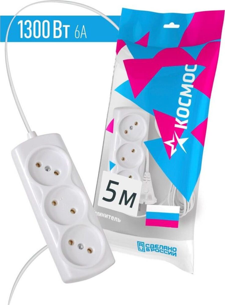 Удлинитель КОСМОС 6А 3 гн ШВВП 2*0,75 (5м) до 1300Вт Россия