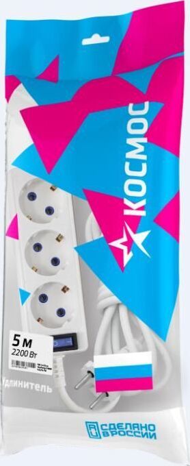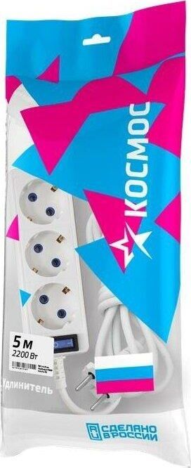 Удлинитель КОСМОС 10А 3 гн ПВС 3*0,75 (5м) 1300Вт с заземл и кнопкой Россия