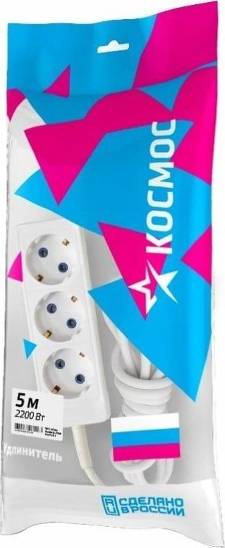 Удлинитель КОСМОС 10А 3 гн ПВС 3*0,75 (3м) 1300Вт с заземл и кнопкой Россия