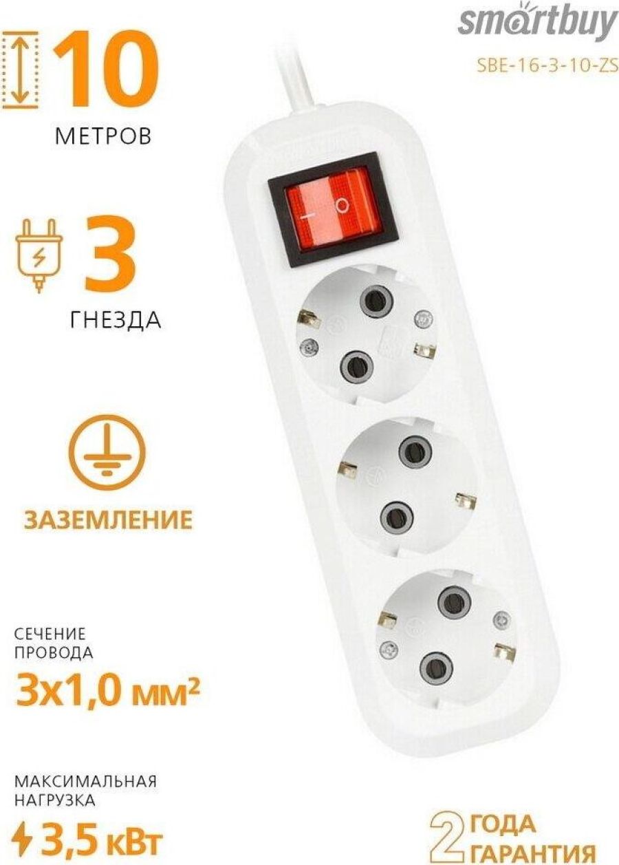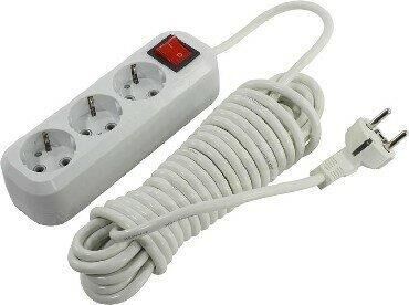 Удлинитель, номинальный ток, А - 16, максимальная мощность, Вт - 3500, количество розеток - 3, сечение провода, мм2 - 3x1,0, материал корпуса ABS-пластик, длина провода - 10 м.