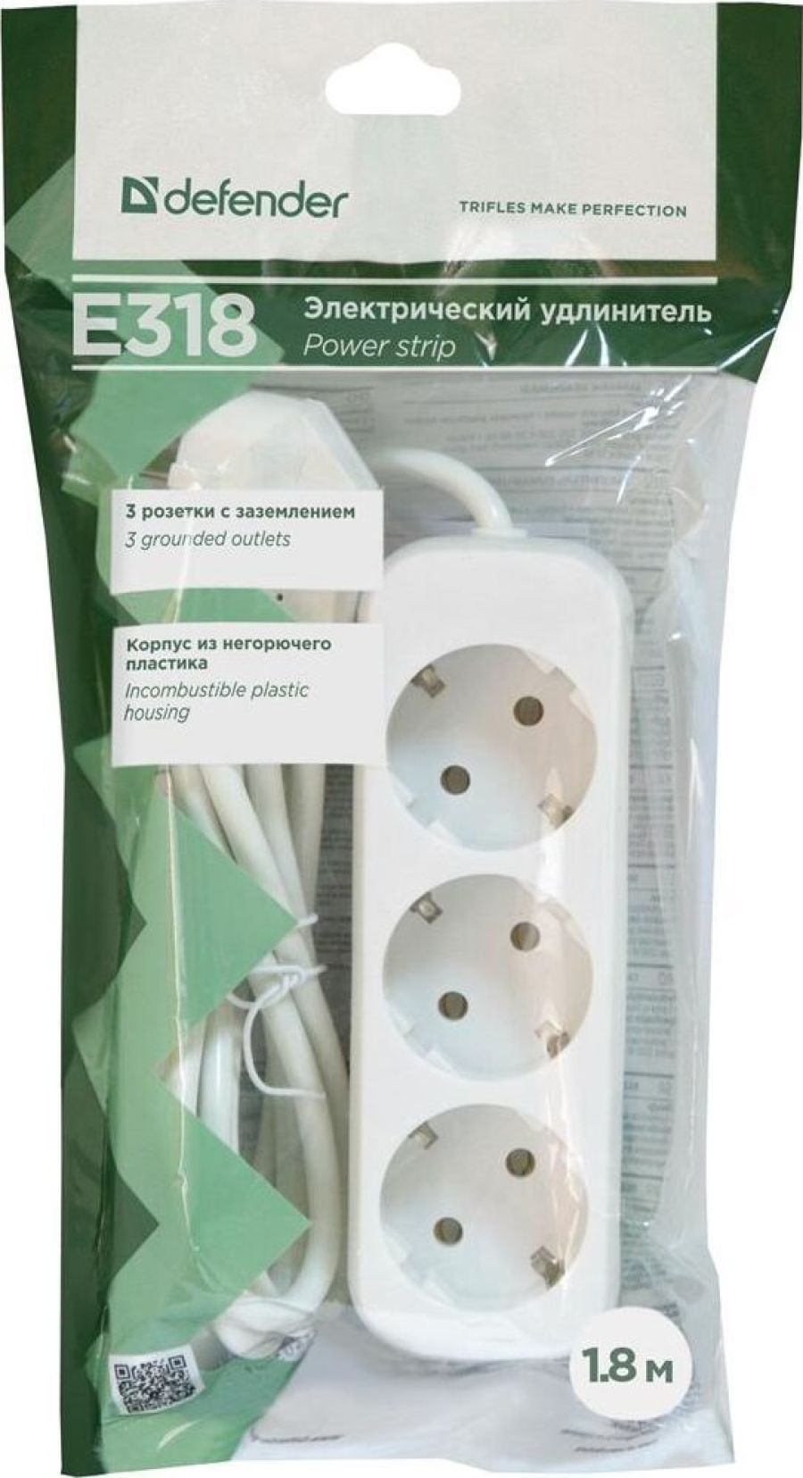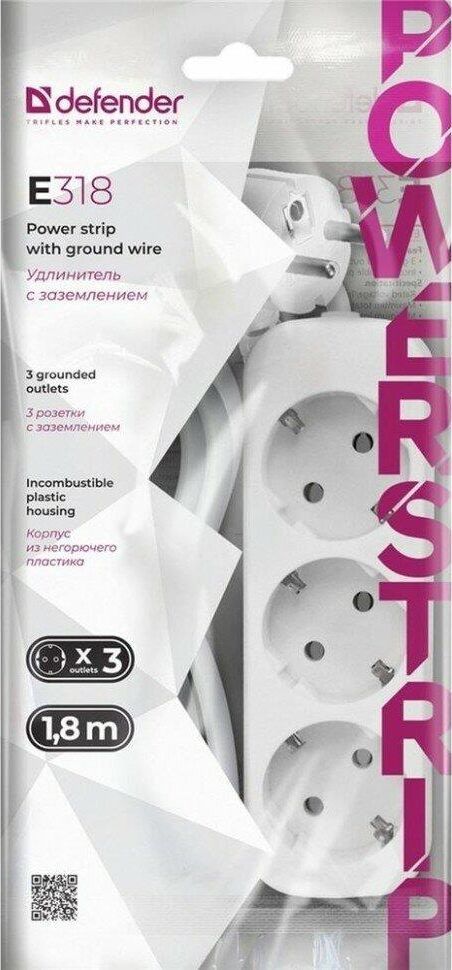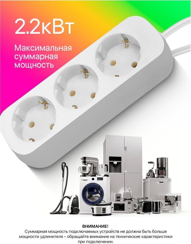Материал корпуса Негорючий пластик, Количество розеток 3 шт. Номинальное напряжение/частота 230 В / 50 Гц, Максимальная суммарная мощность нагрузки 2200 Вт, Максимальный ток нагрузки 10 А, Длина 1.8 м