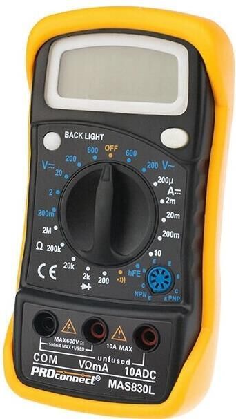 Характеристики: Постоянное напряжение: 200mВ/2В (±0,5%+3), 20В/200В (±0,8%+5), 600В (±1%+5) Переменное напряжение: 200В/600В (±2%+10) Постоянный ток: 200мкА/2мА/20мА (±1,8%+2), 200мА(±2,0%+2), 10A (±2,0%+10) Сопротивление: 200Ом (±1,0%+10), 2КОм/20КОм/200КОм/2МОм (±1,0%+4) Тестирование диодов Прозвонка целостности цепи Режим "DATA HOLD" Подсветка дисплея 3,5х разрядный дисплей Размер (мм): 135*67*33мм Тип батареи: Rexant 9В Крона (в комплекте) Противоударный чехол в комплекте Вес: 145г (включая батарею)