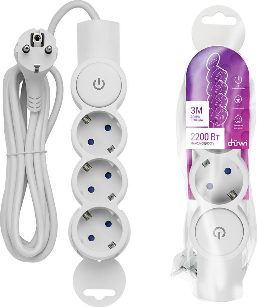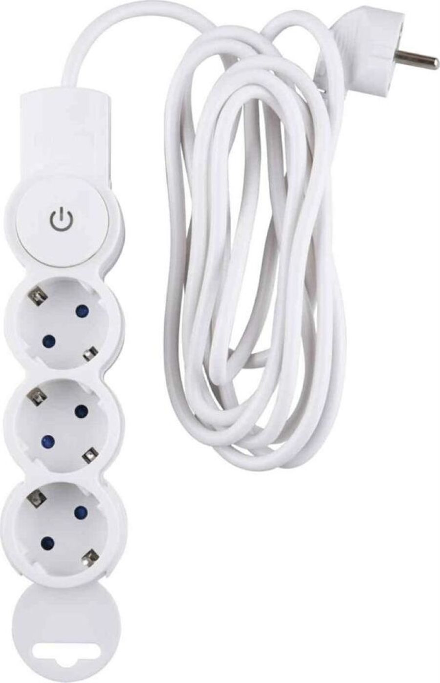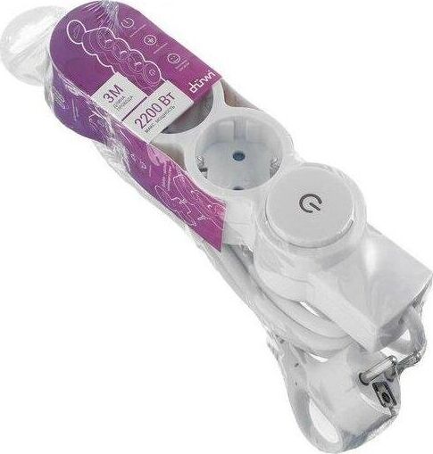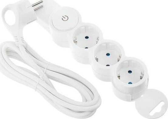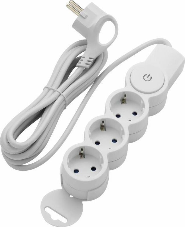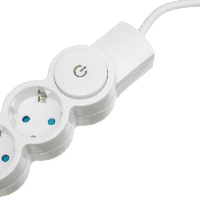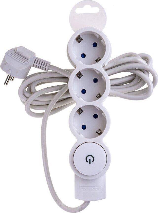 Удлинитель бытовой, с заземлением и ножным кнопочным выключателем с подсветкой, количество гнезд - 3, подключаемая мощность : 2200 Вт, степень защиты: IP20, тип провода и сечение: 3Gх0,75, цвет: белый, длина: 3,0 м.