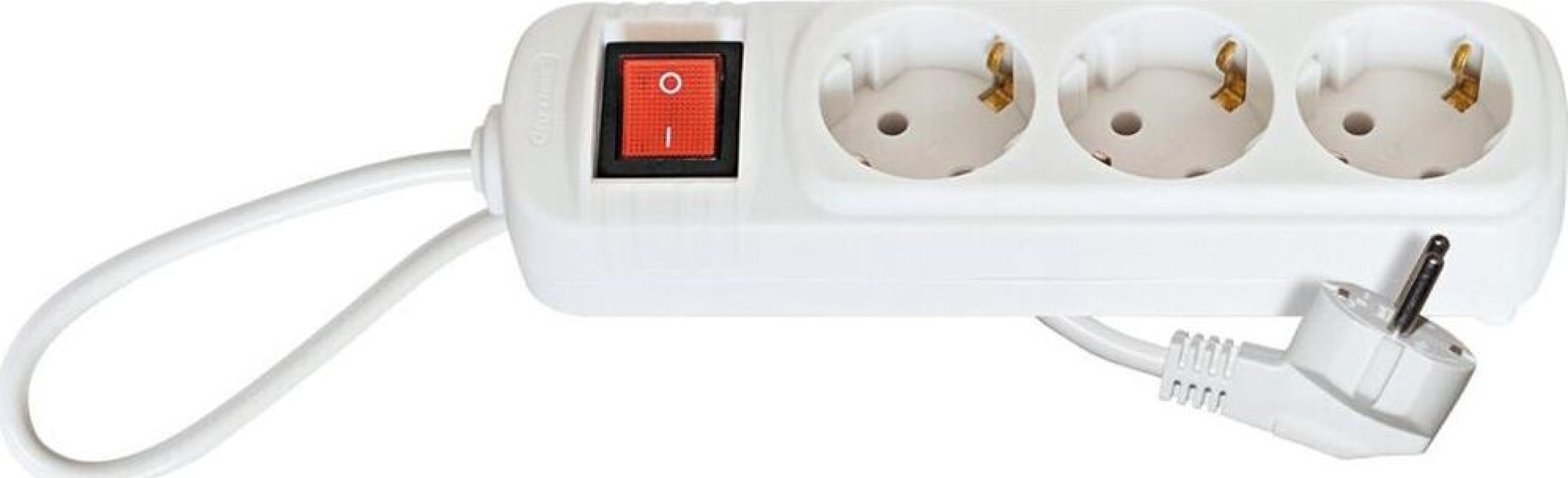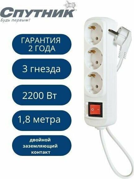3 - розетки без заземления, длина шнура 1, 8 м, трехжильный кабель ПВС, номинальное напряжение 220 В, рабочая частота 50-60 Гц, максимальный ток 6А, степень защиты IP20.