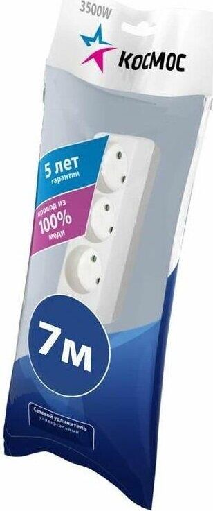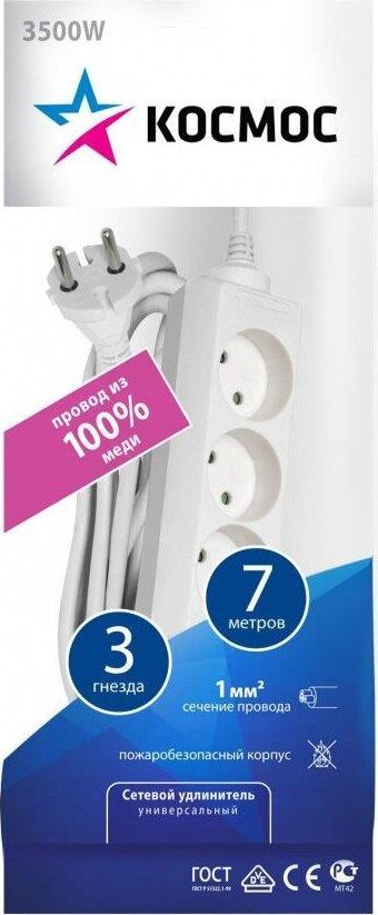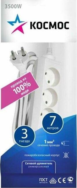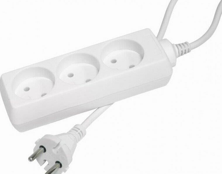 7метра,3розетки,ПВС 2х1мм до 1300Вт (16А,220В)